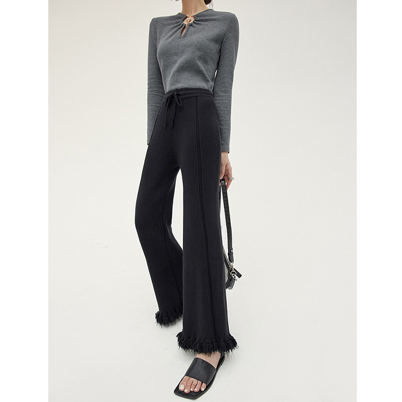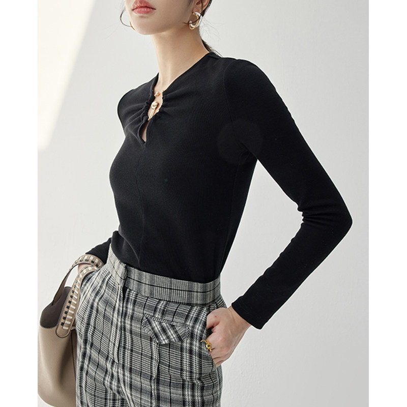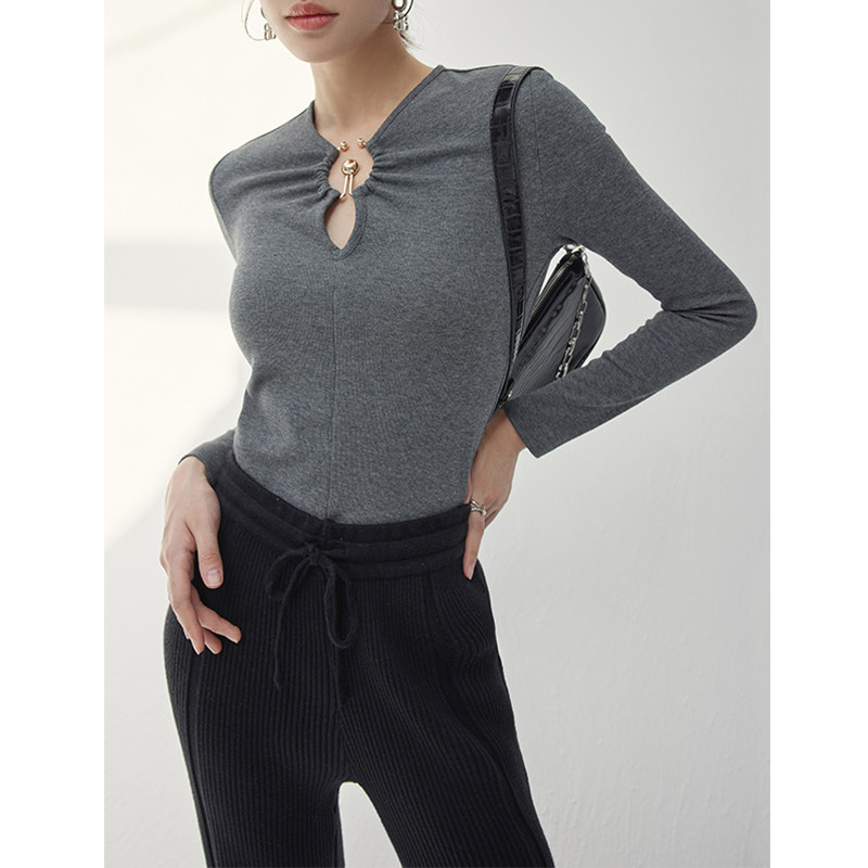 金属环长袖T恤秋冬新款小众设计V领镂空上衣修身显瘦气质打底衫