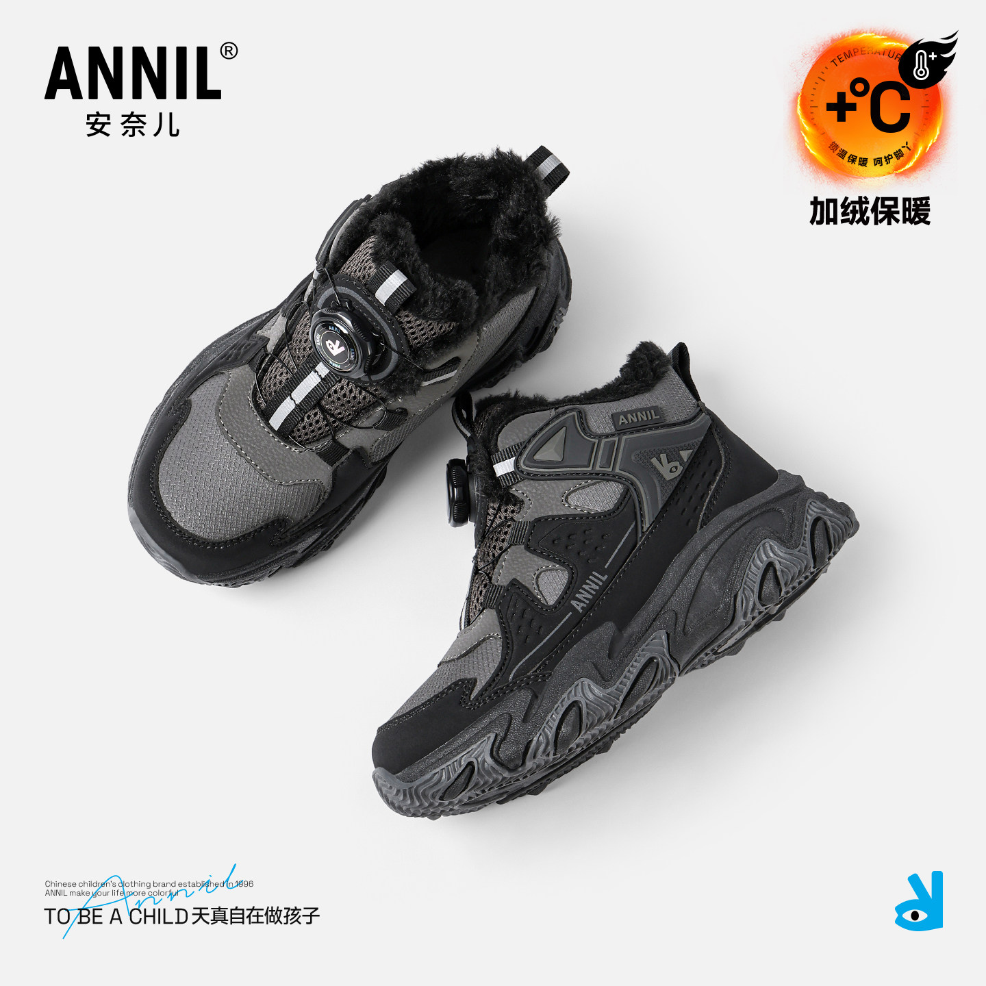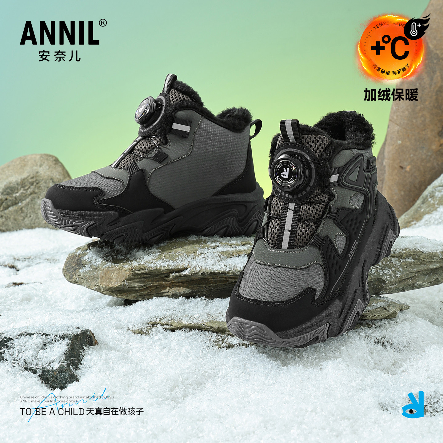 安奈儿男童高帮运动鞋2026新款冬季大童雪地鞋加绒加厚儿童大棉鞋