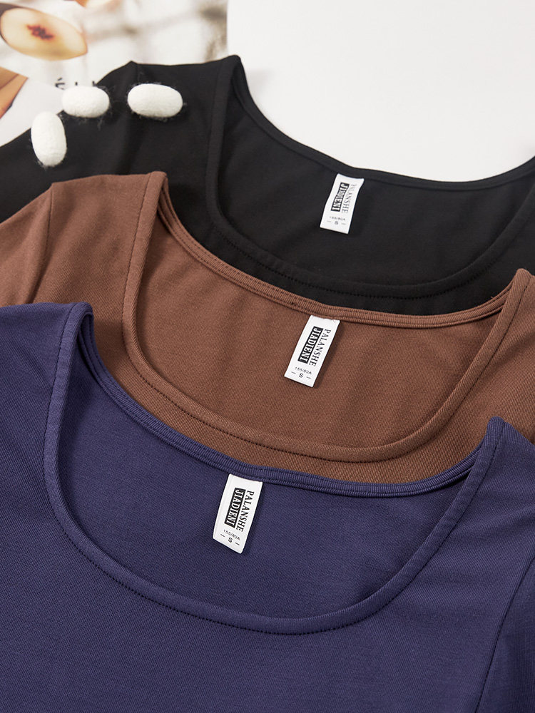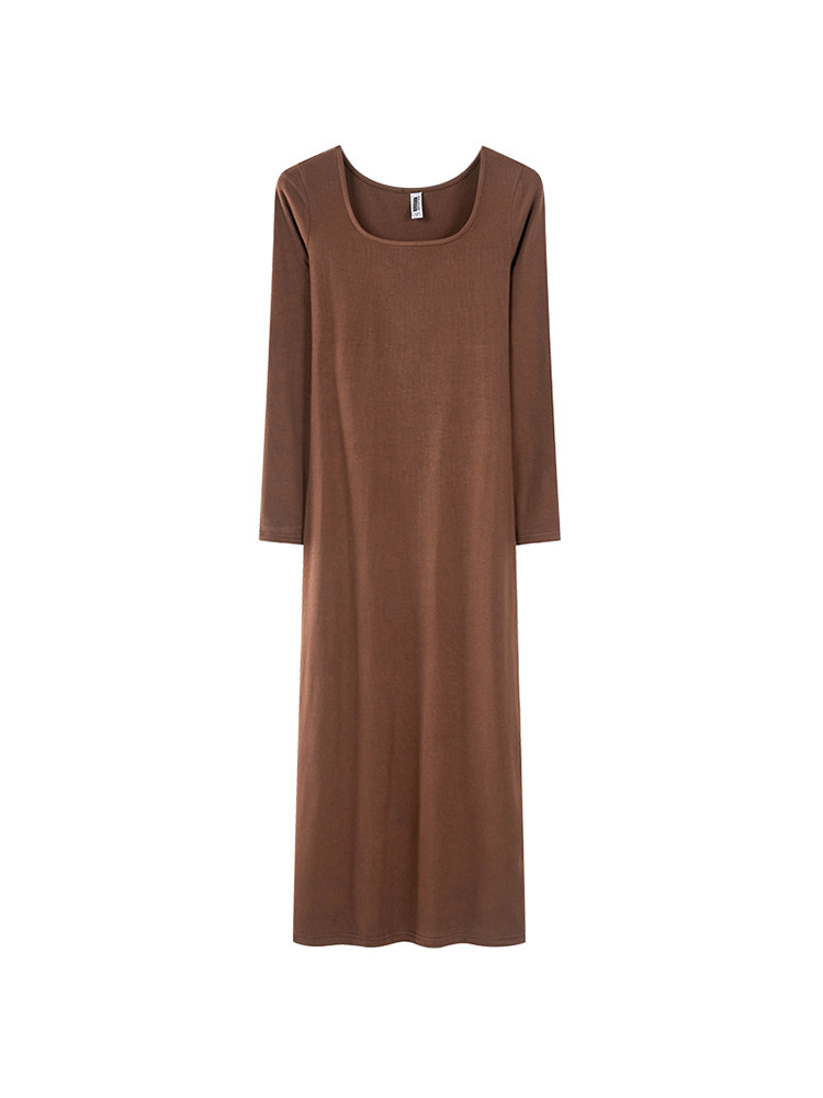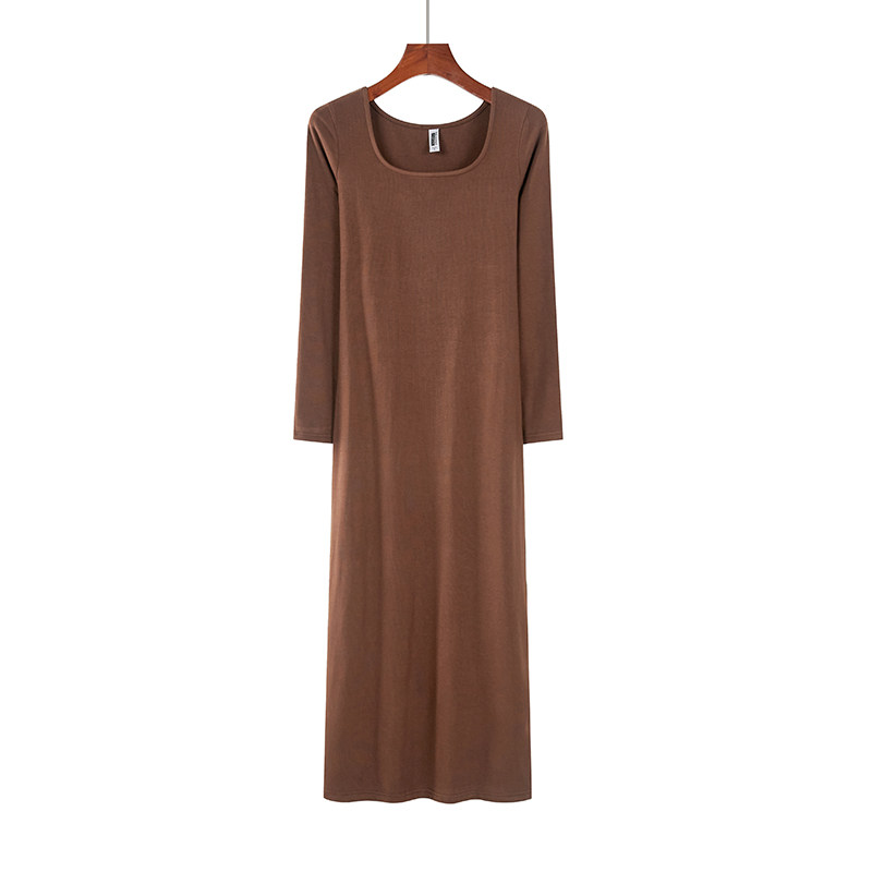 早春新款韩版U领修身纯棉纯色长袖体恤加长款连衣裙显瘦女装紧身