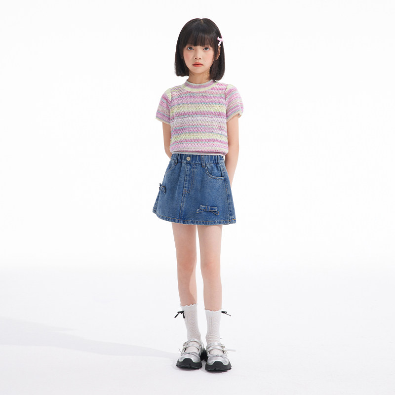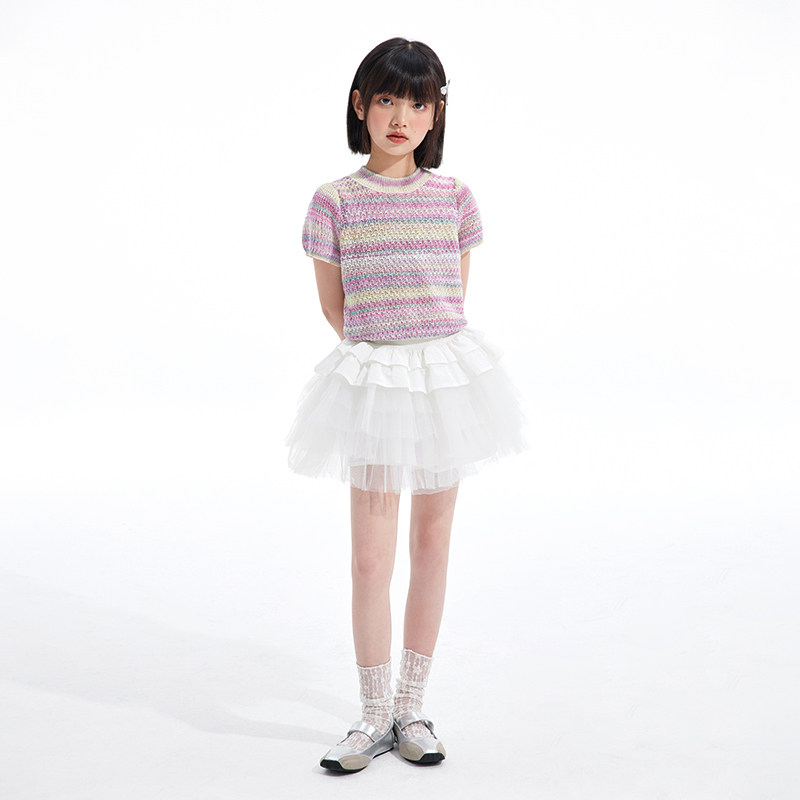 311线报网描述:女童 渐变色镂空针织修身短袖上衣