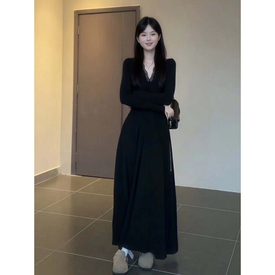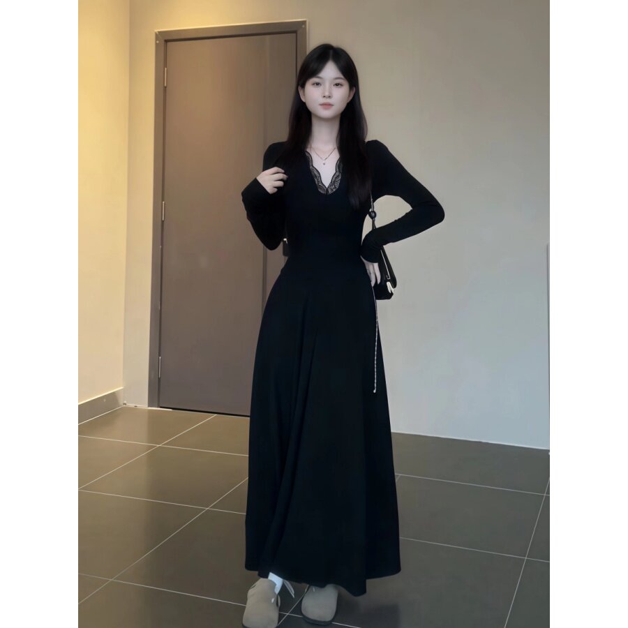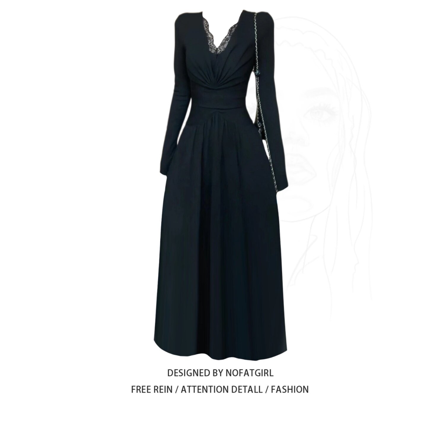 大码胖MM法式黑色蕾丝花边V领收腰连衣裙气质高级感褶皱大摆长裙