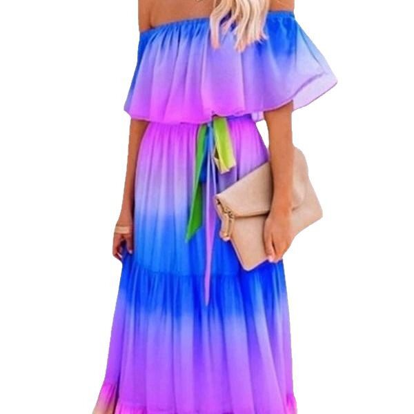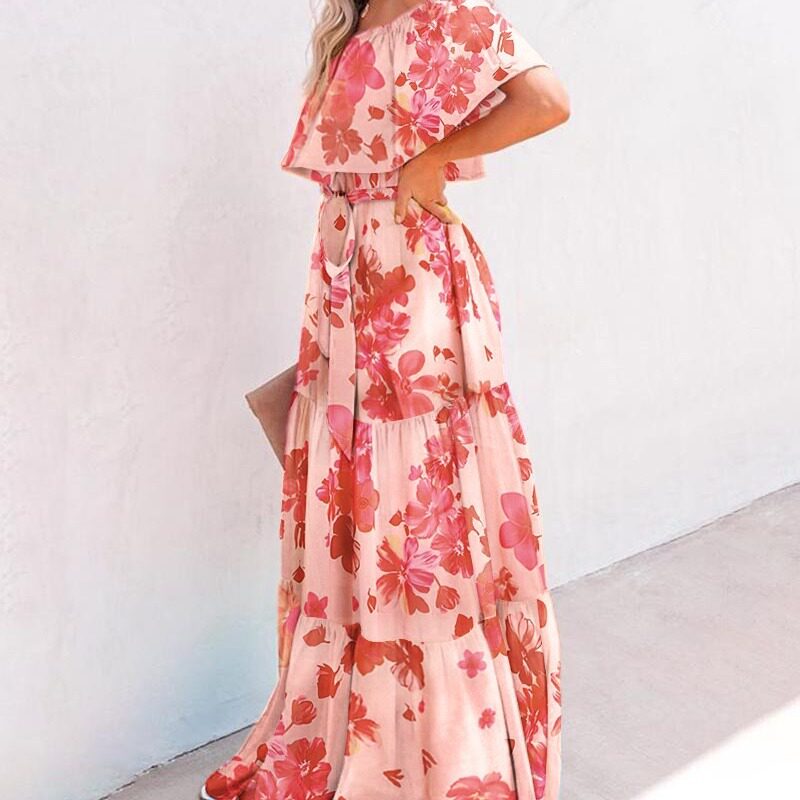 跨境长裙印花吊带型高腰气质通勤棉小香风粉色吊带连衣裙一件代发