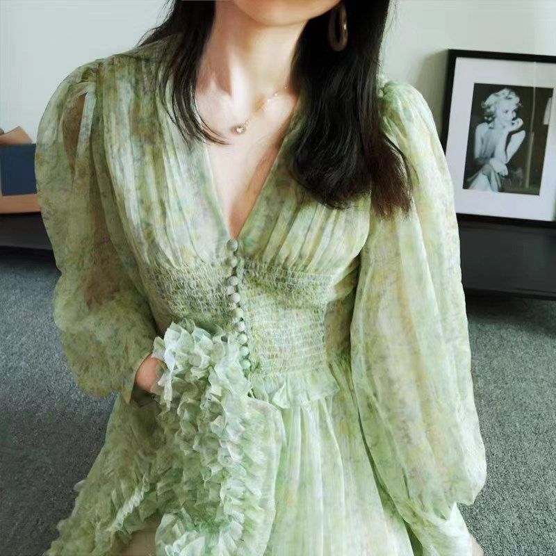 2024春秋新款法式短款长袖收腰仙气飘飘初恋雪纺小个碎花连衣裙夏