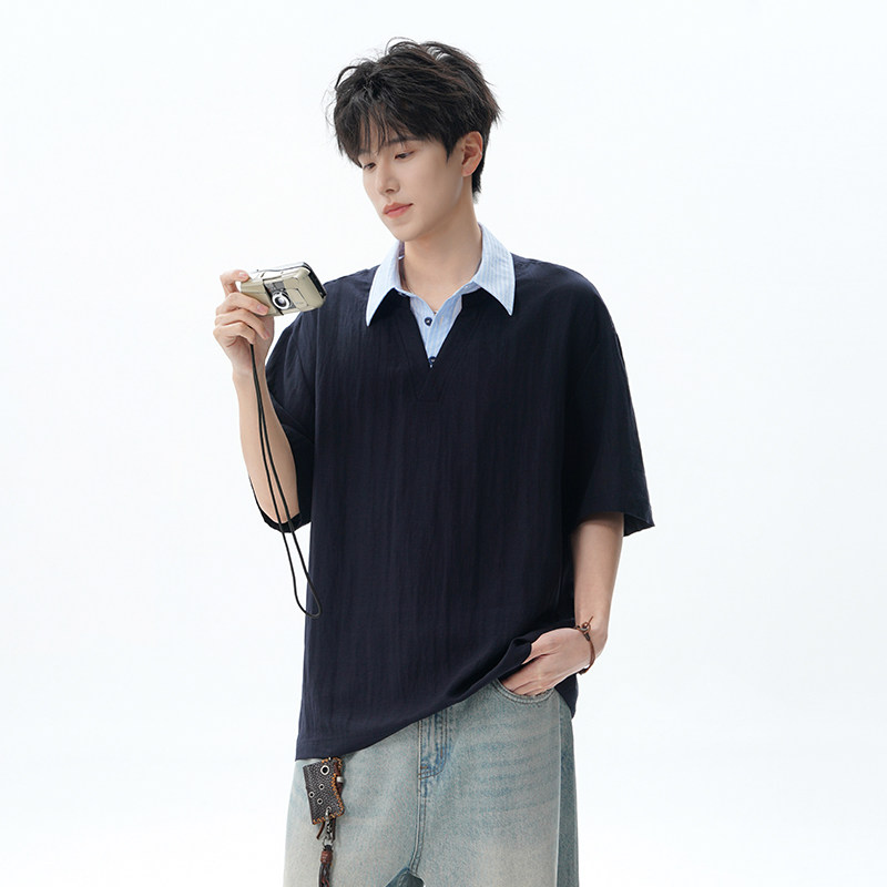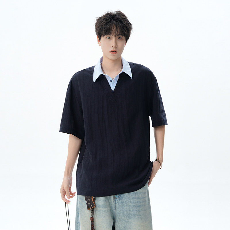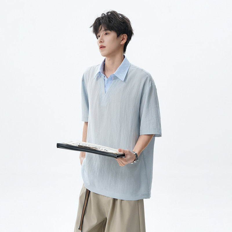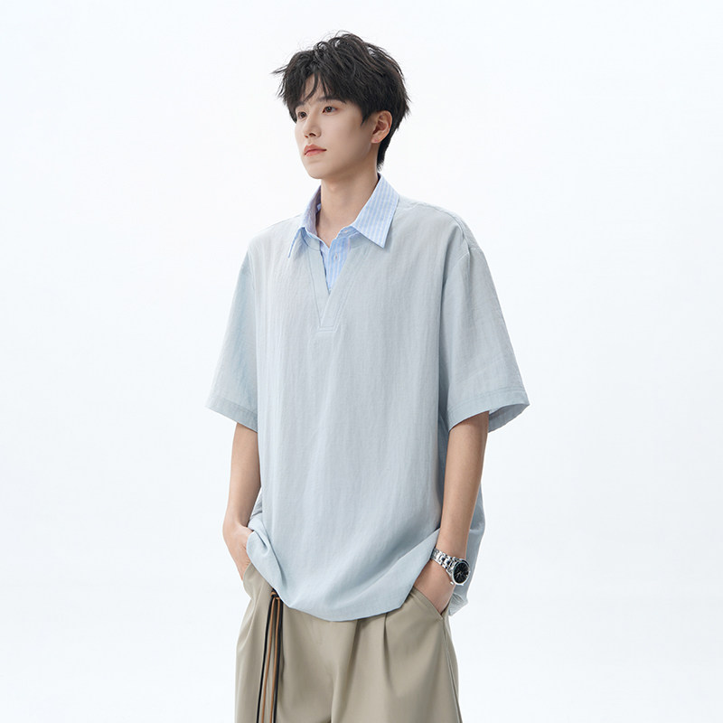 【假两件】雅鹿天丝短袖polo衫男衬衫领上衣莱赛尔青少年亚麻T恤