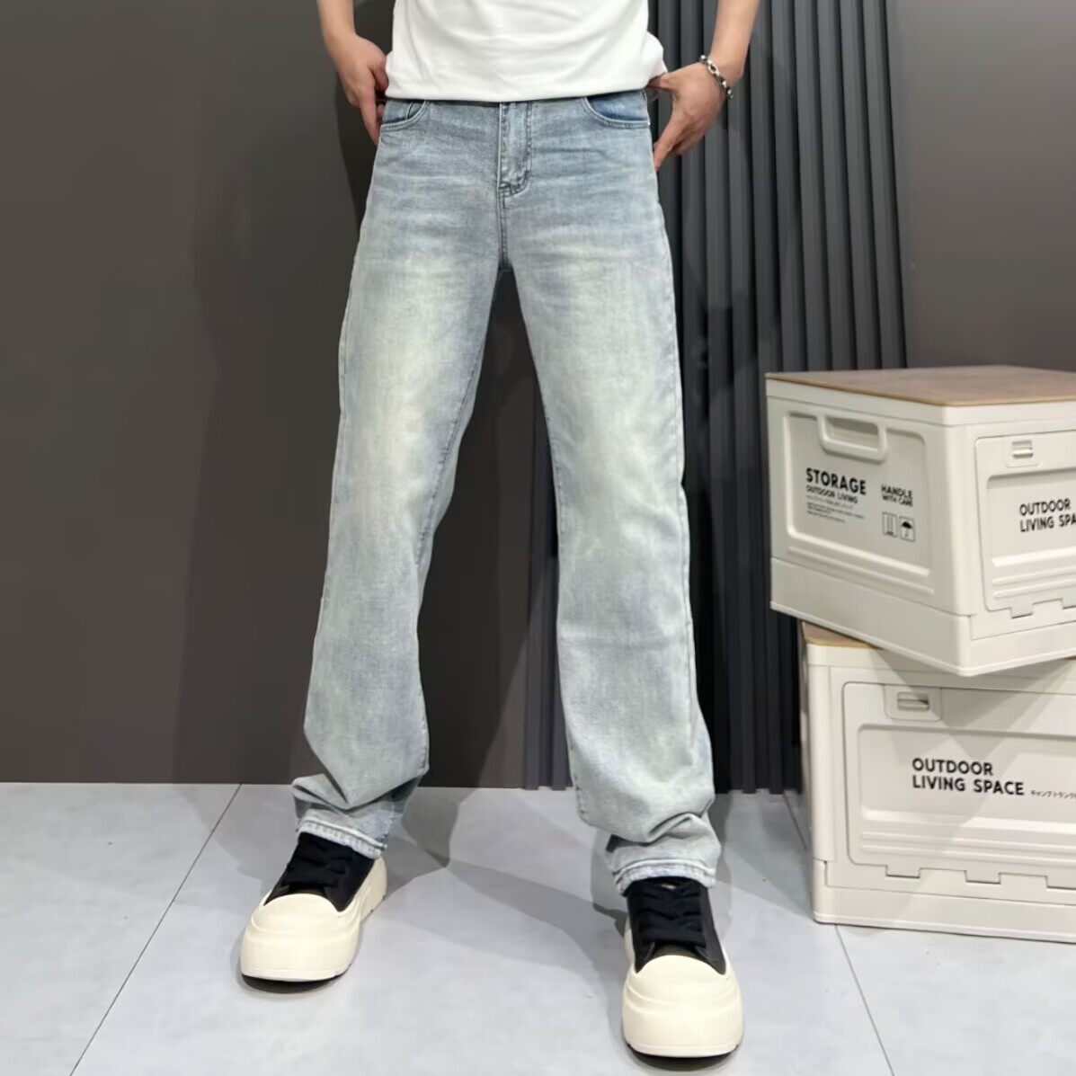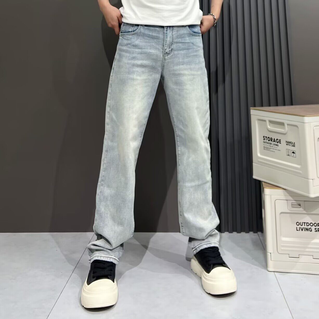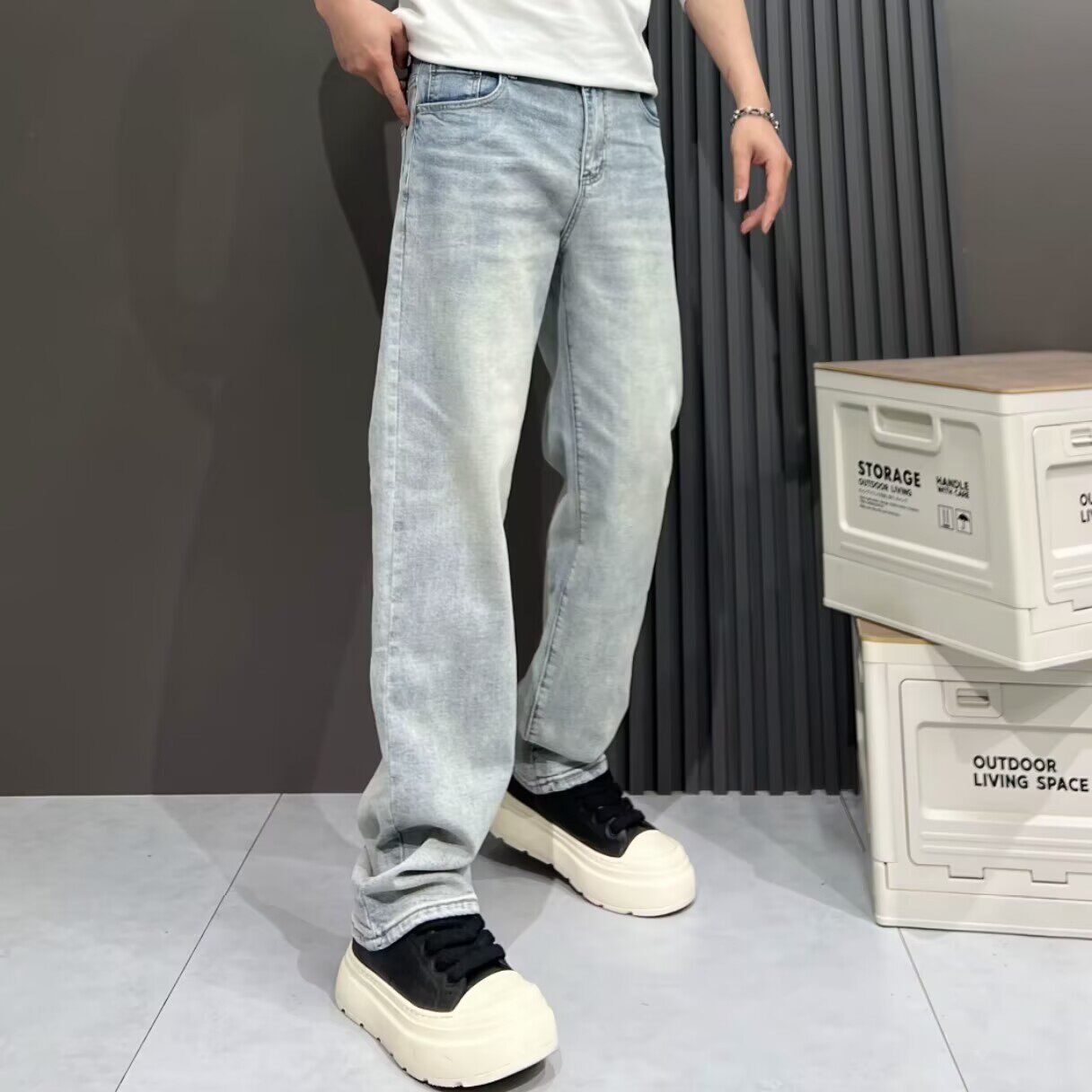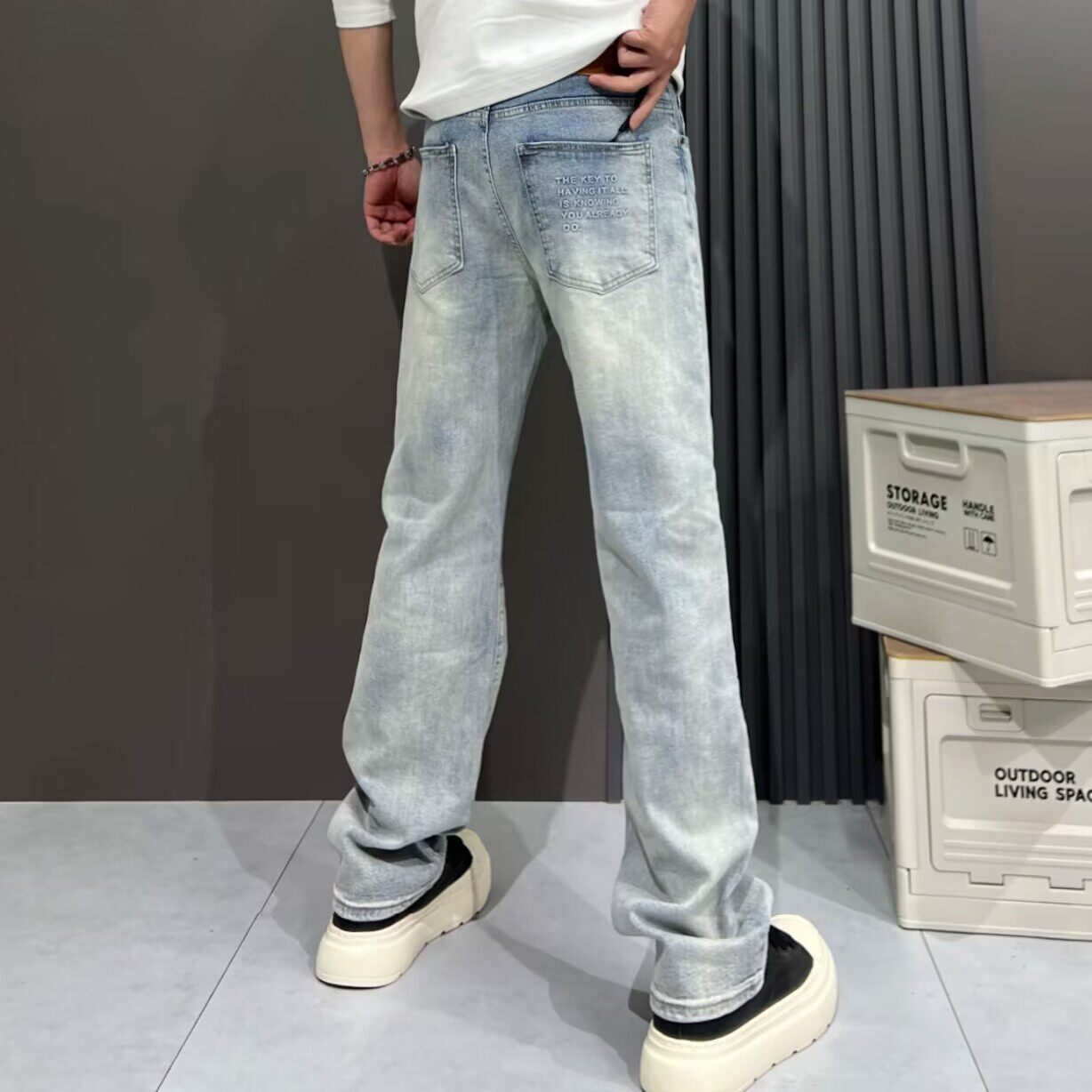 高端美式复古浅蓝色牛仔裤男宽松直筒2026春夏季新款字母压花长裤