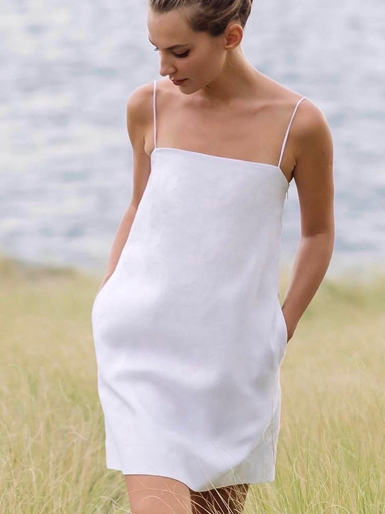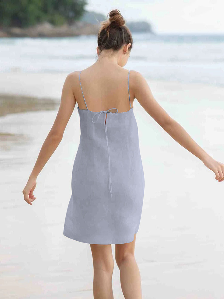 海边度假棉麻吊带裙短款露背女夏季性感中裙一字领亚麻连衣裙子