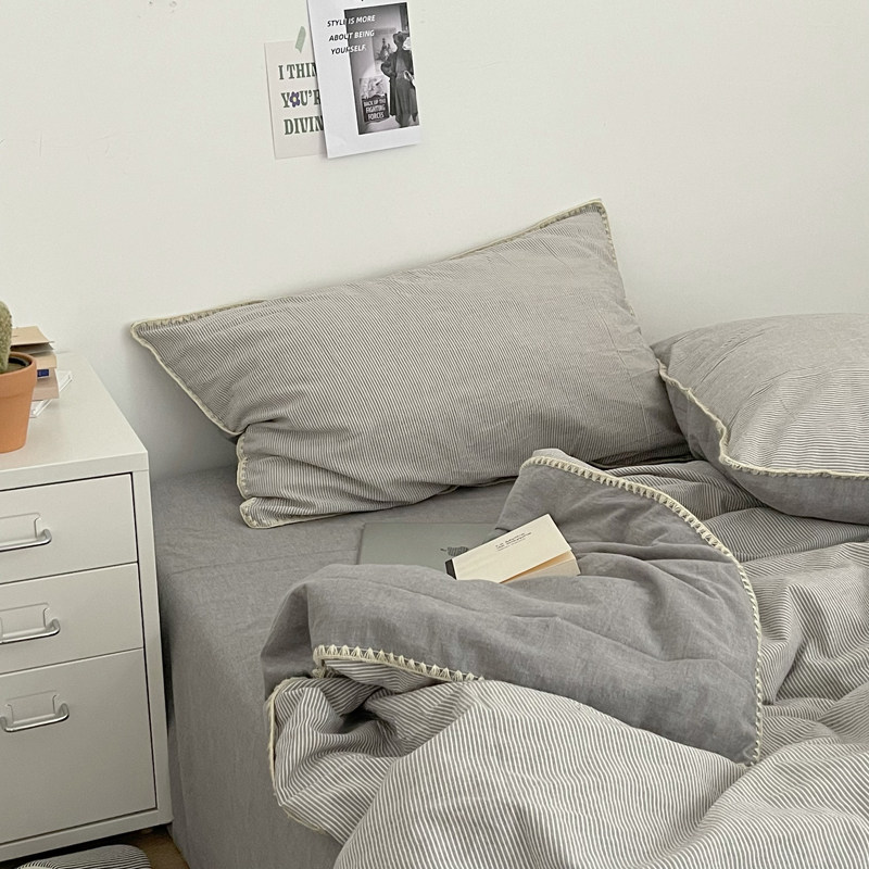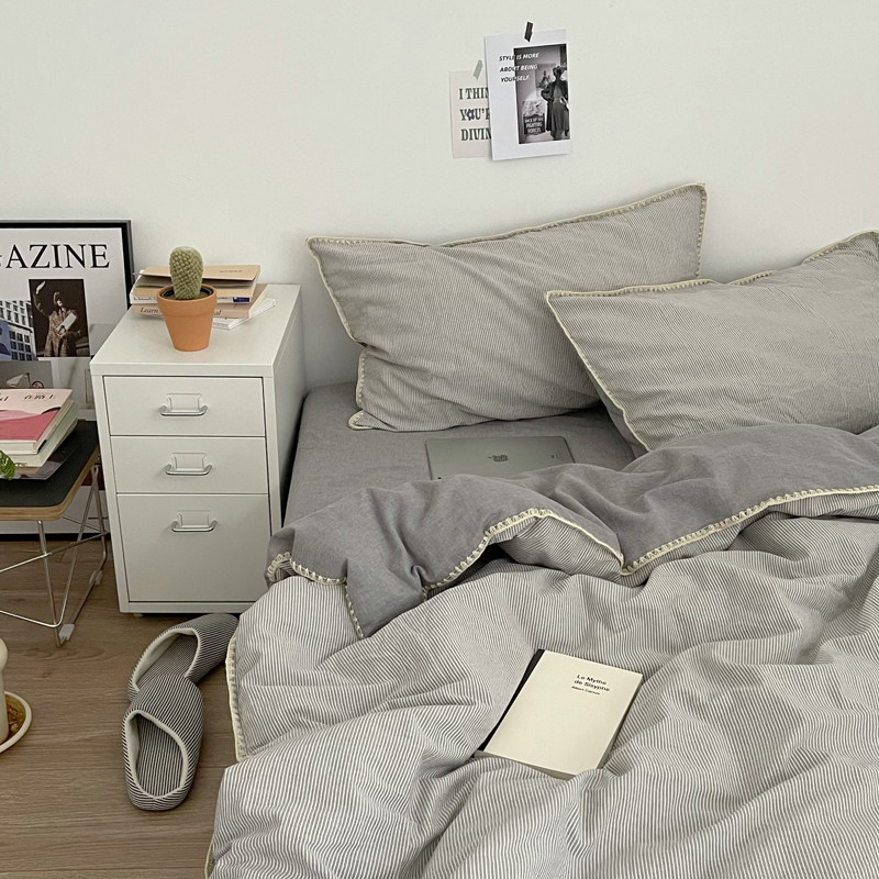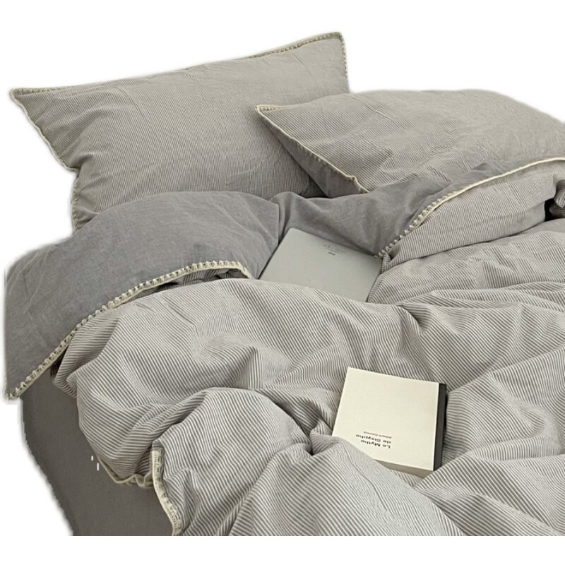 日式简约风灰色细条纹纯棉四件套北欧风全棉被套床上用品男生床单