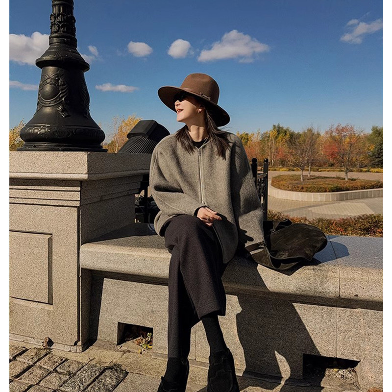 100%羊毛双面呢短款外套女圆领拉链宽松显瘦毛呢大衣2025秋冬新款
