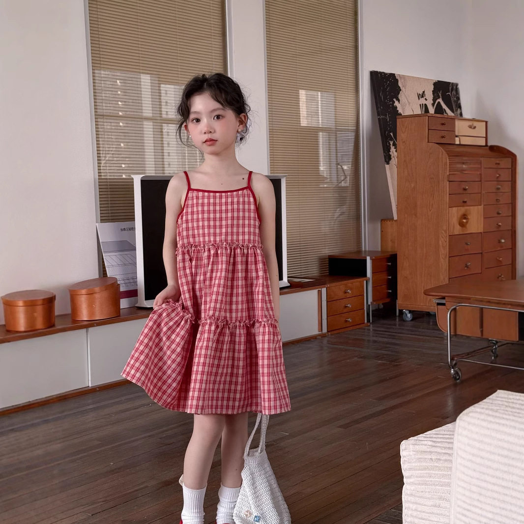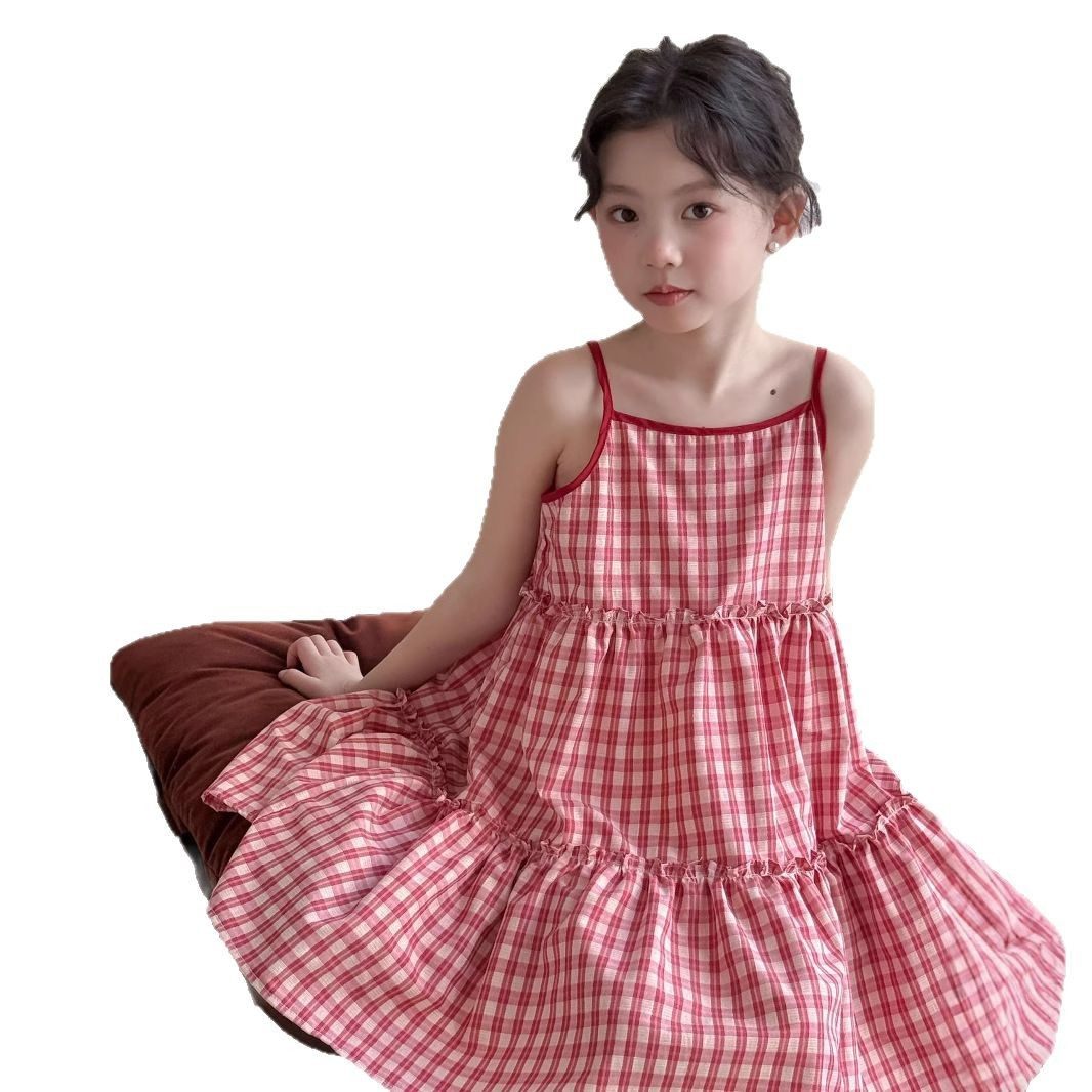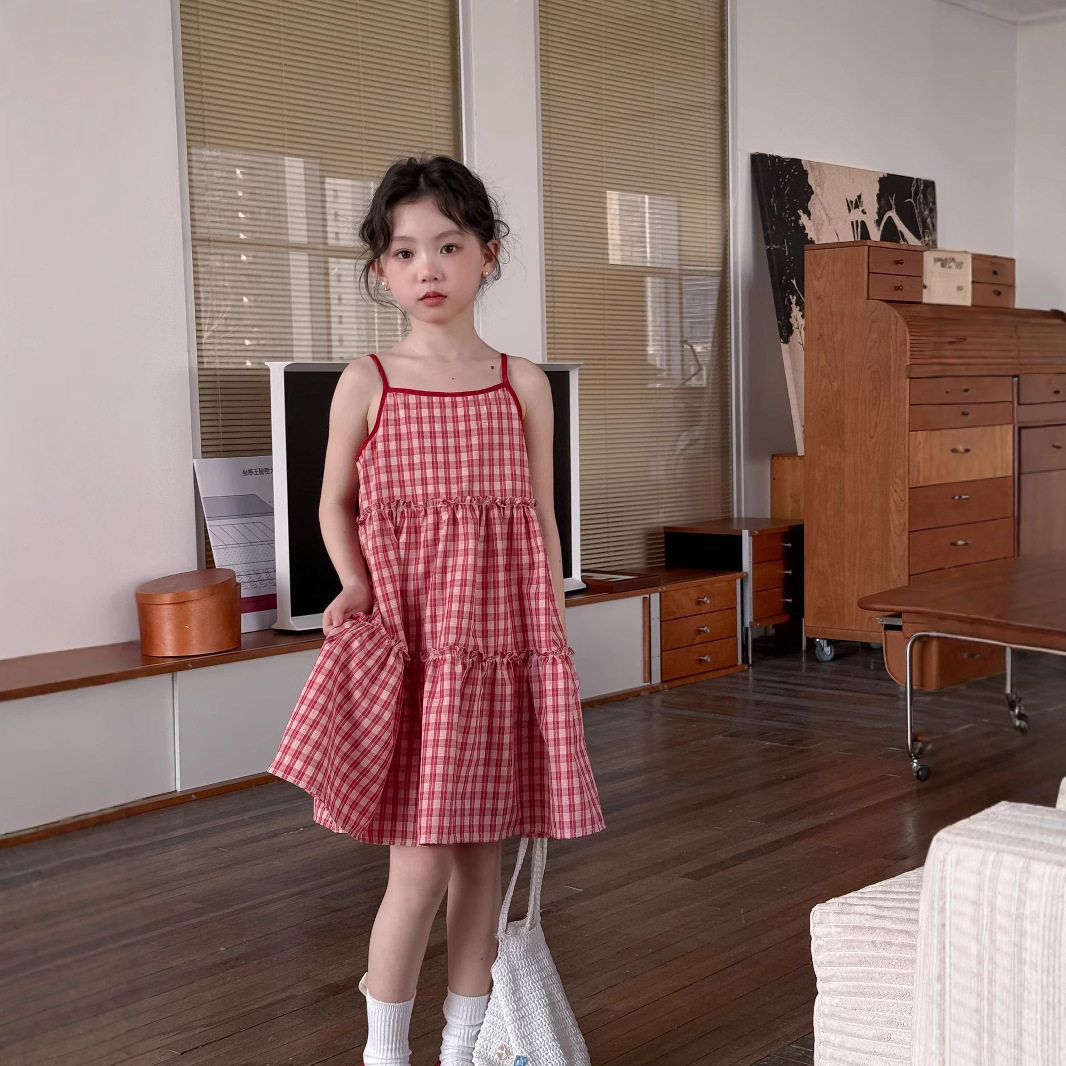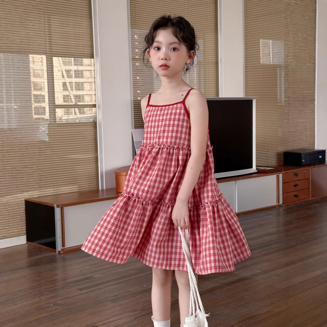 小女孩红色格子吊带连衣裙童裙子夏季女童甜美儿童装度假风公主裙