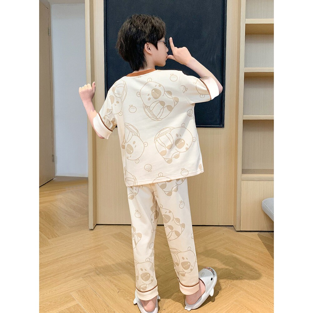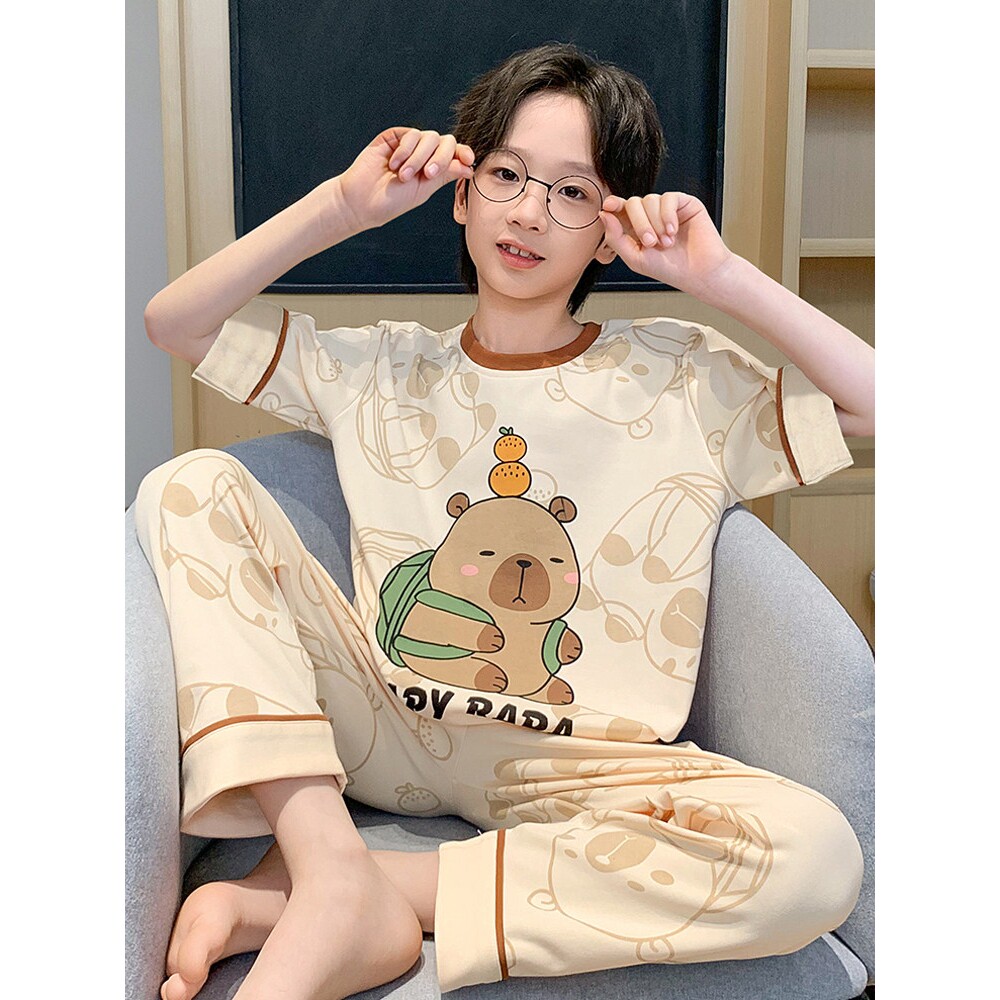 全棉纯棉男童睡衣春夏季空调服半袖长裤纯棉卡皮巴拉短袖男孩大儿