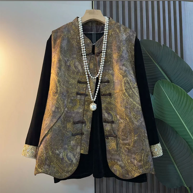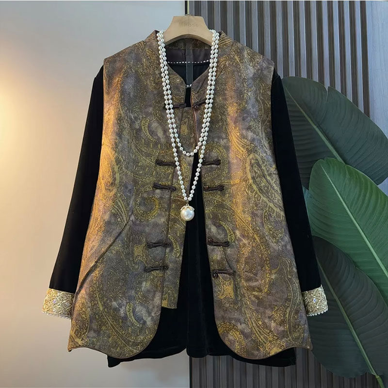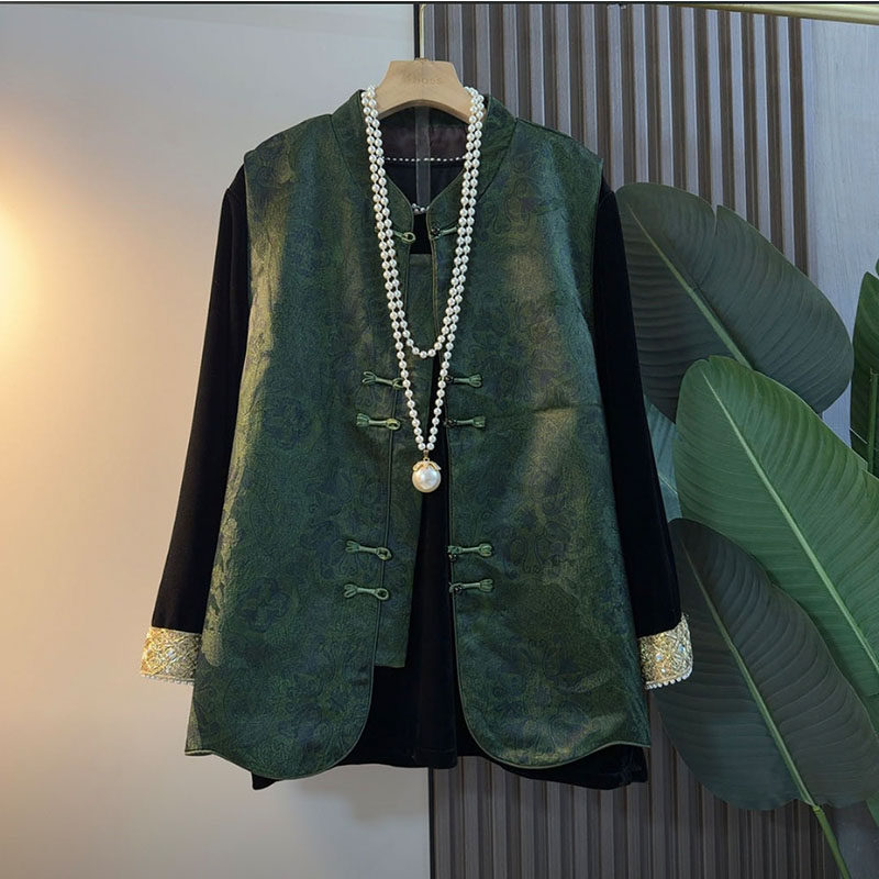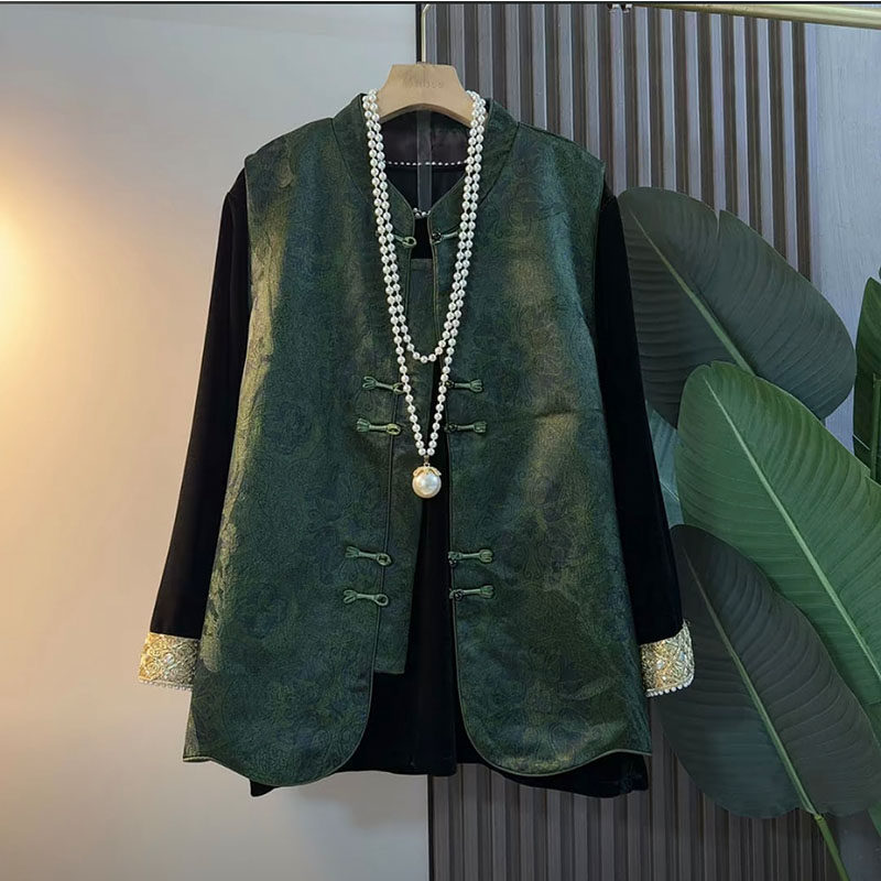 新中式2026春款大码女装轻奢国风提花盘扣马甲丝绒小衫显瘦两件套