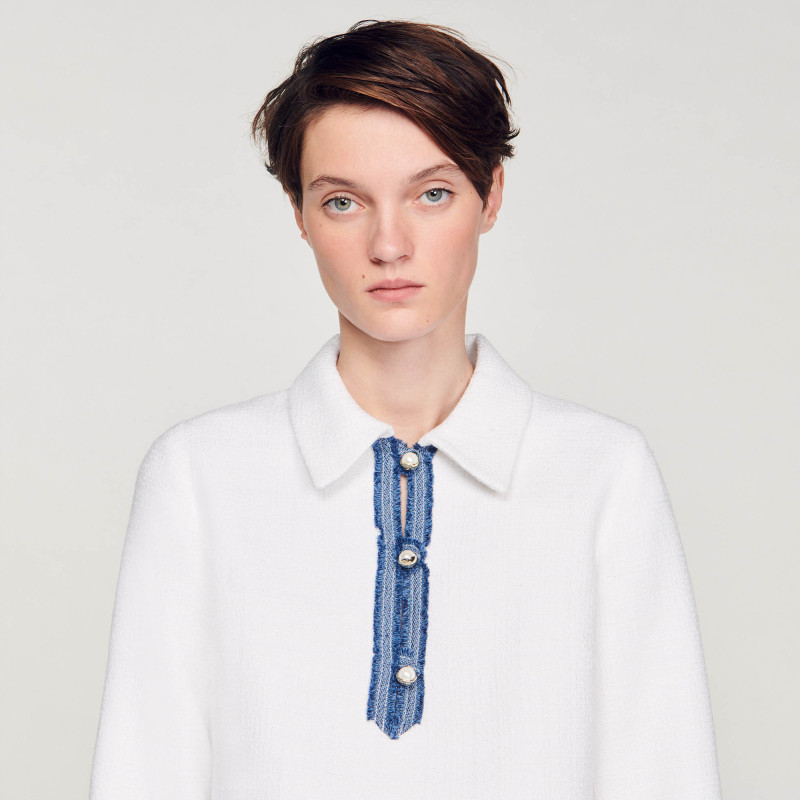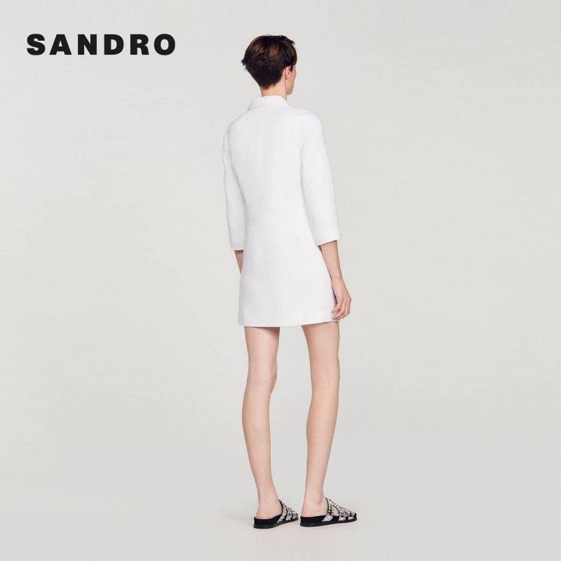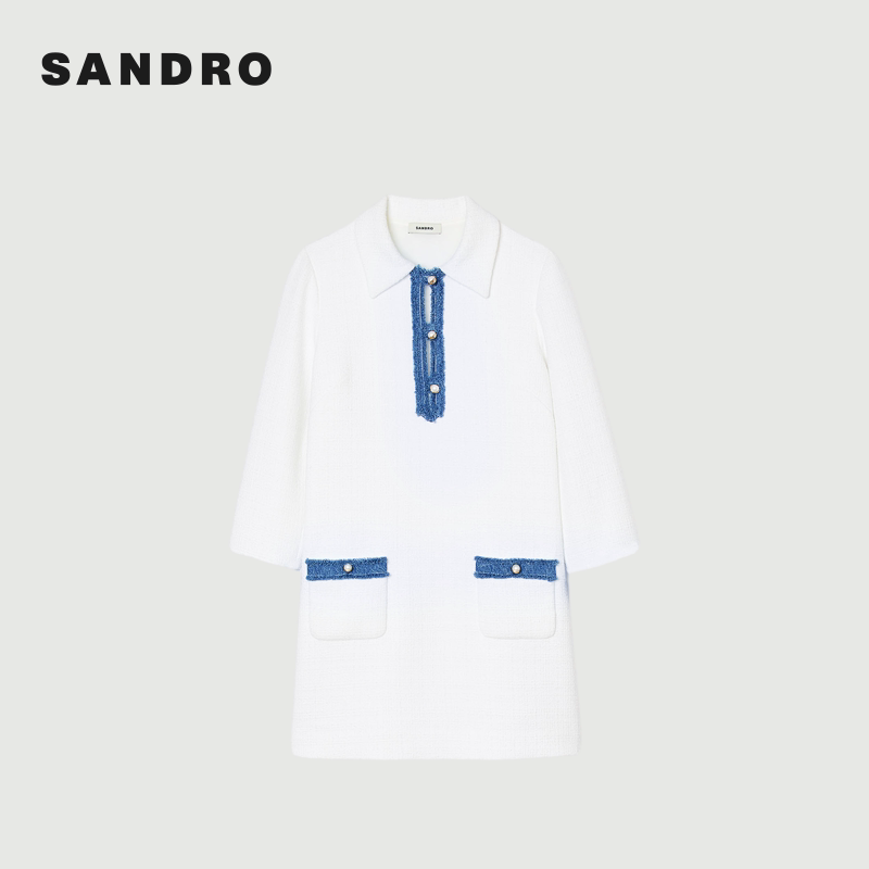 SANDRO Outlets秋冬女装法式白色polo领珠型纽扣短款针织连衣裙