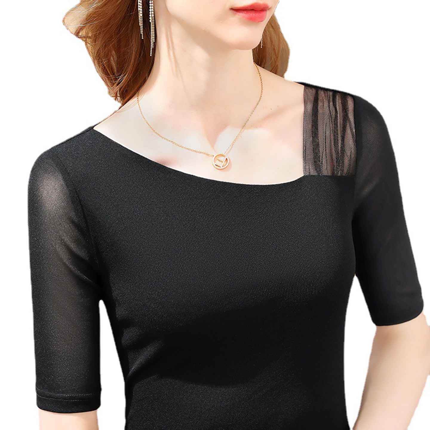 2026新款洋气斜领网纱t恤女中袖纱衣别致女款沙体上衣纱料小衫春
