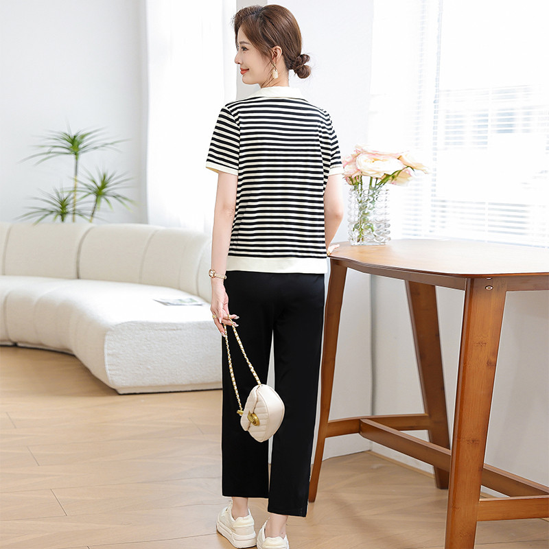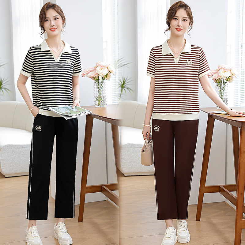 妈妈夏装新款洋气条纹短袖套装上衣中老年奶奶休闲运动服两件套女