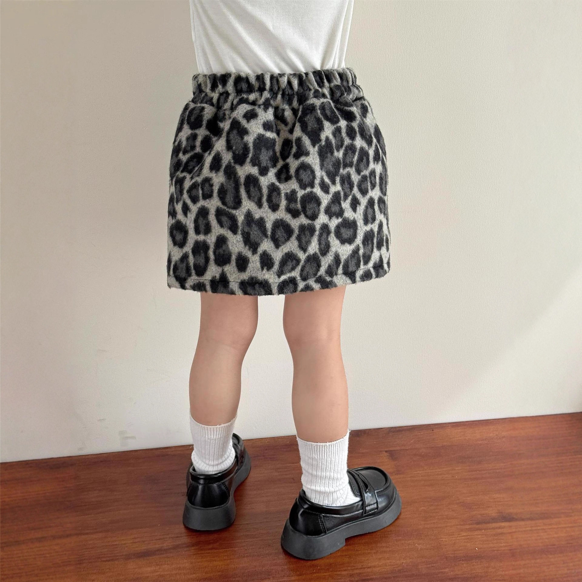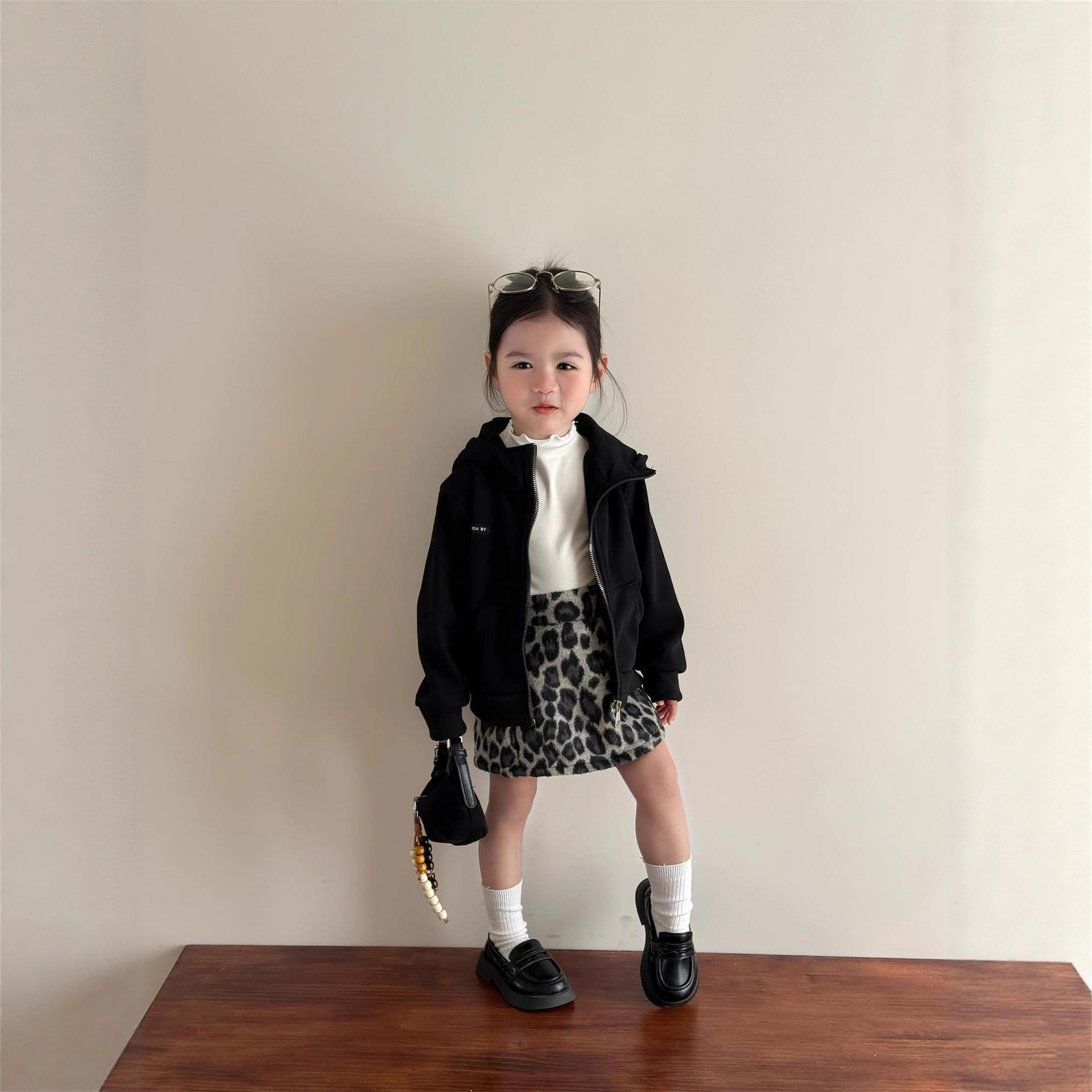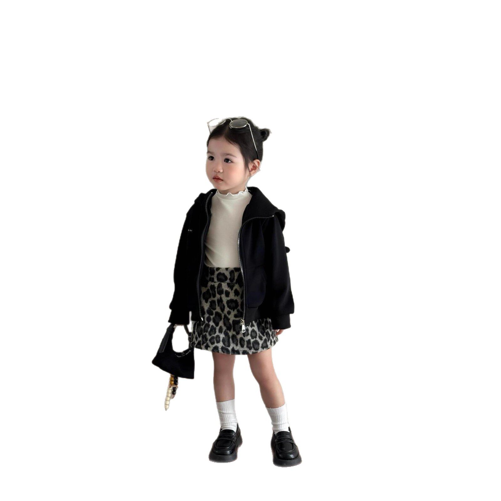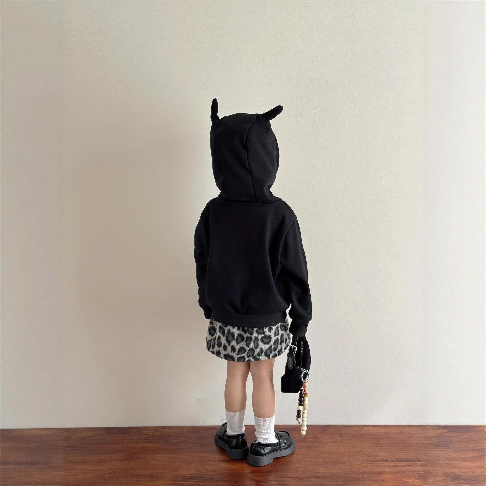 女童秋冬新款黑色奥绒复合一体搞怪恶魔立体耳朵连帽卫衣+豹纹裙