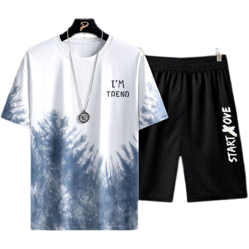 新款冰丝速干渐变两件套男生短袖t恤夏季短裤运动青少年休闲套装