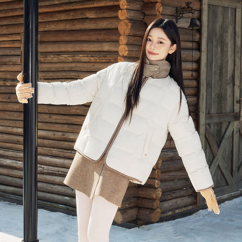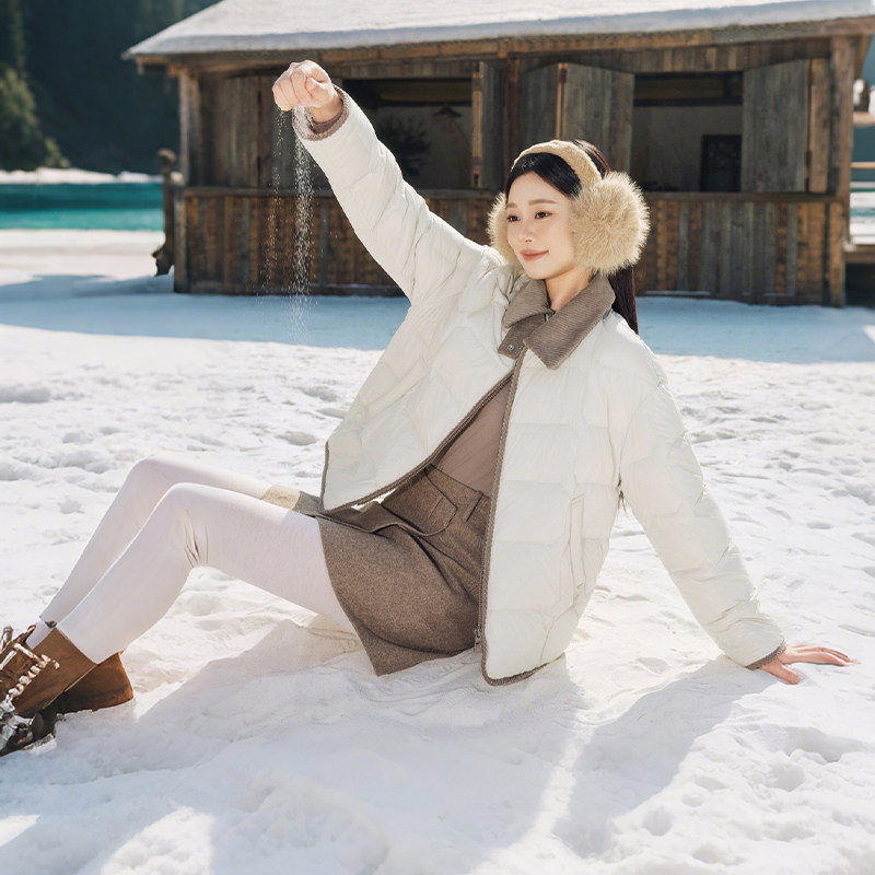 坦博尔轻薄羽绒服女翻领秋冬季新品衬衫领时尚撞色灯芯绒拼接外套