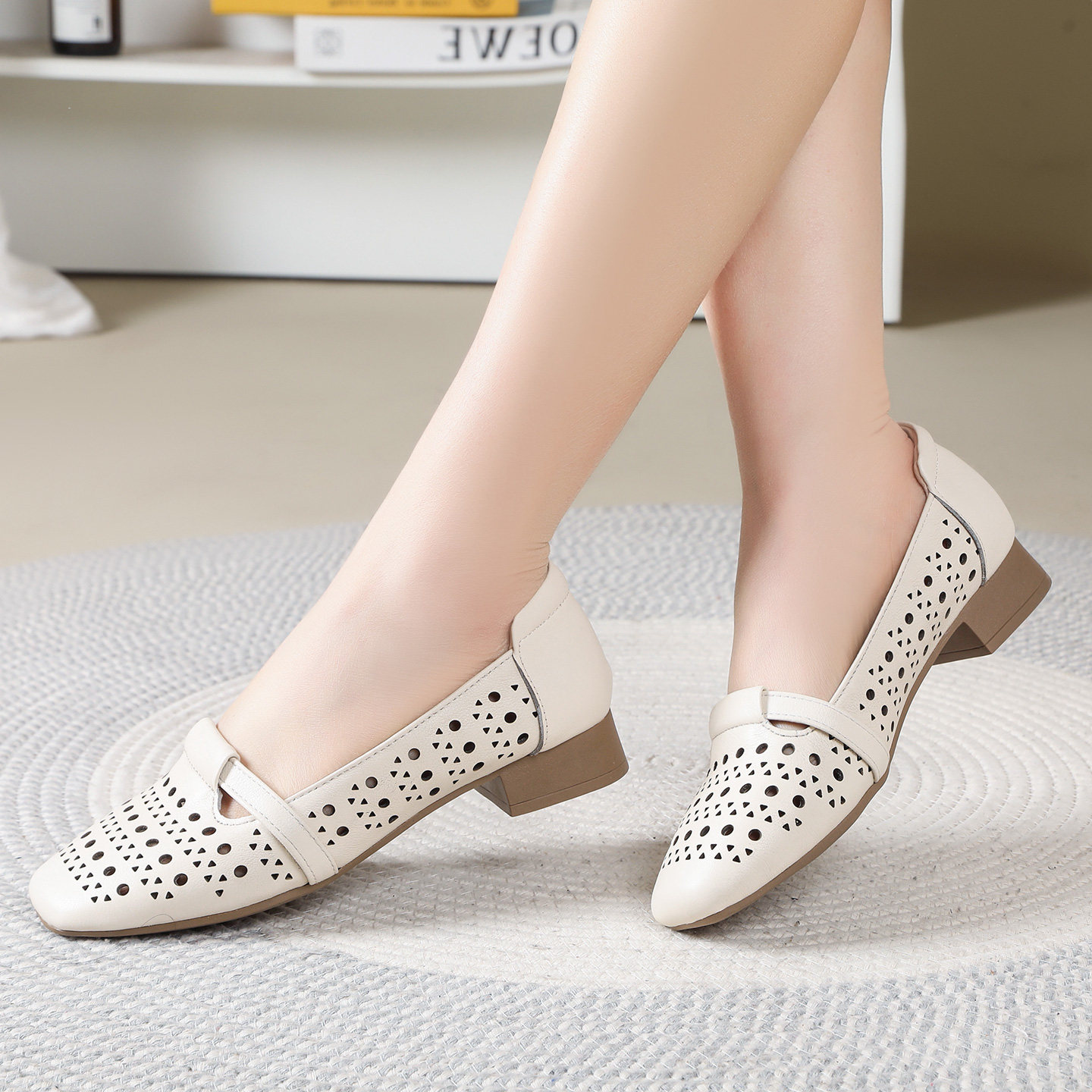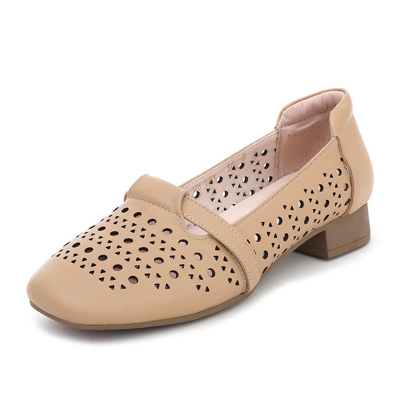 真皮镂空洞洞鞋女春夏浅口透气单鞋一脚蹬小皮鞋舒适不累脚妈妈鞋