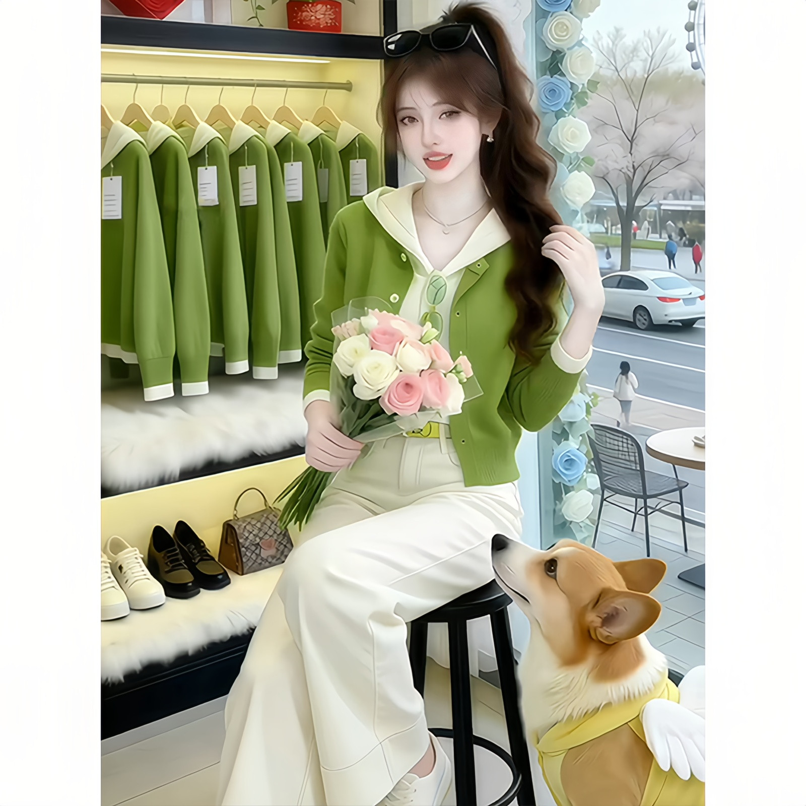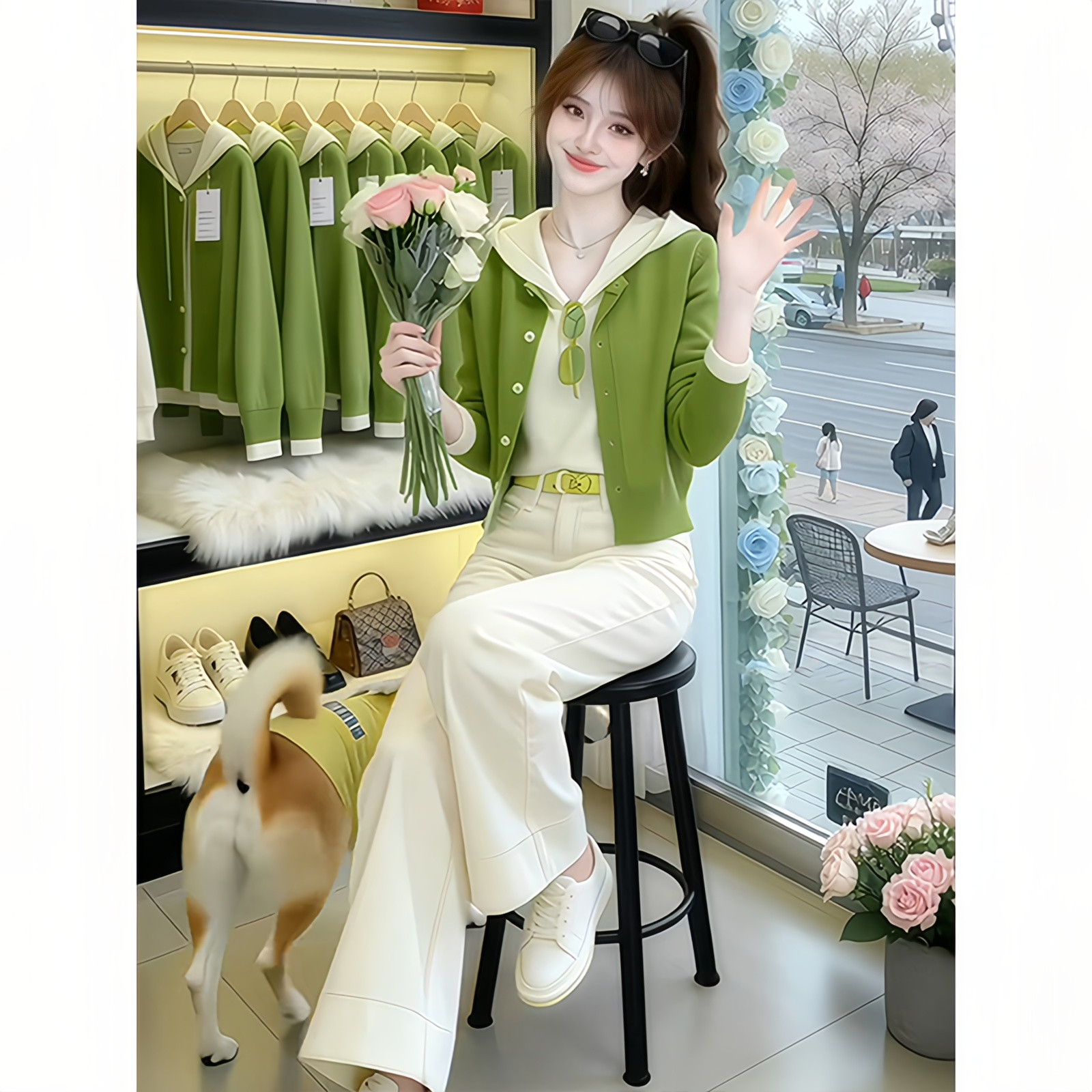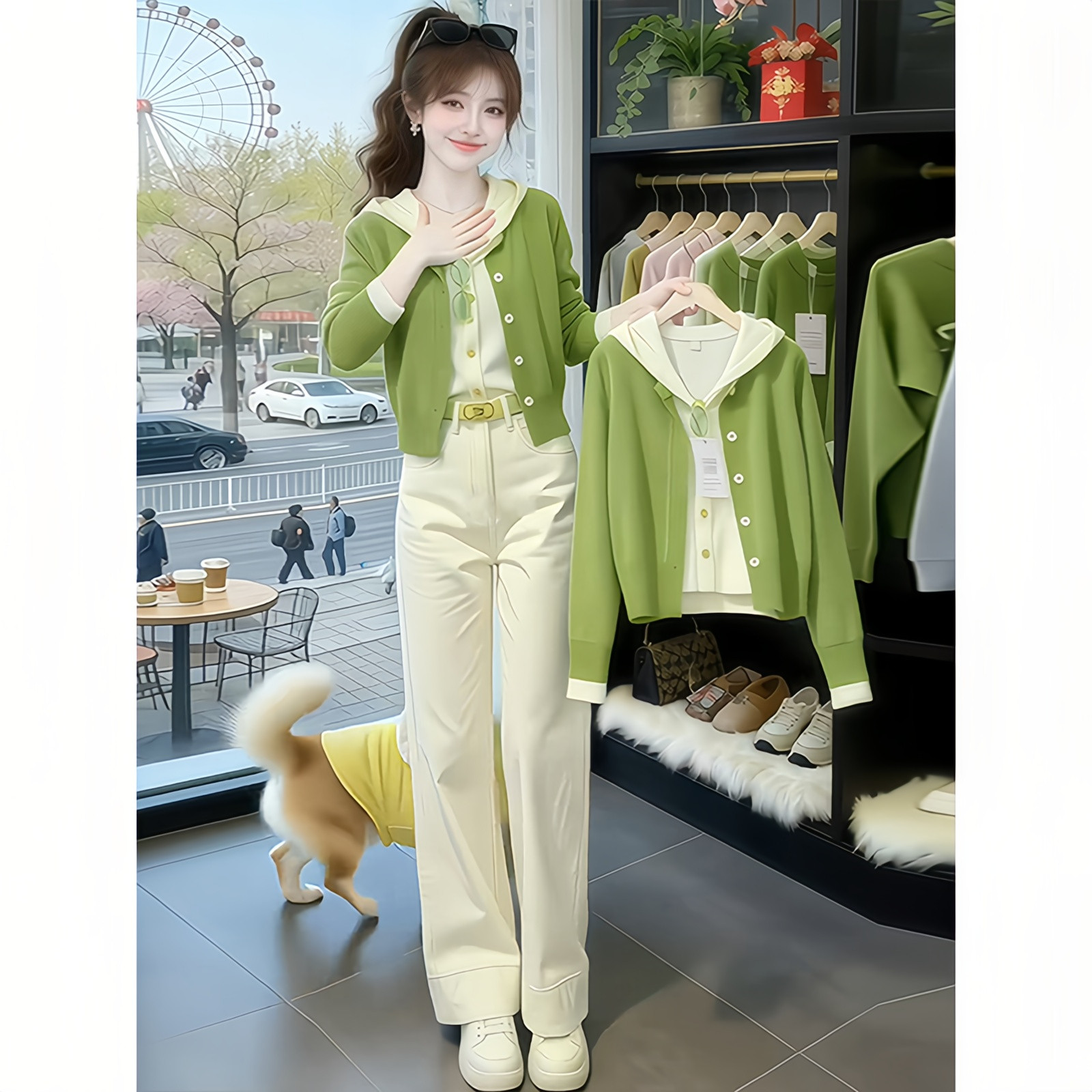 绿色假两件针织衫春装女款2026新款时尚洋气连帽毛衣开衫外套上衣