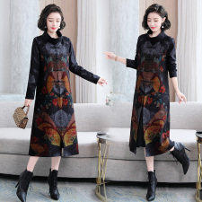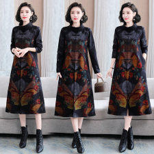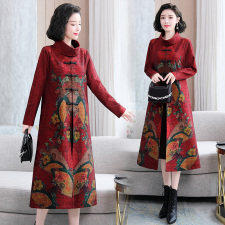中国风印花连衣裙女红色长袖气质显瘦大码妈妈装中长裙