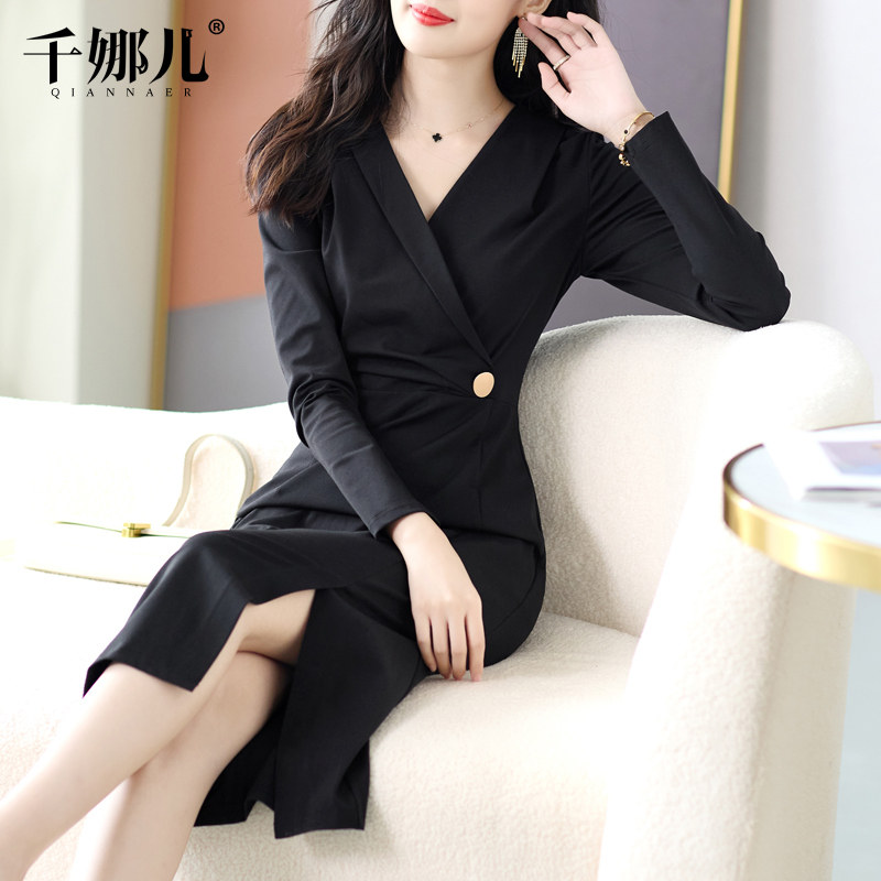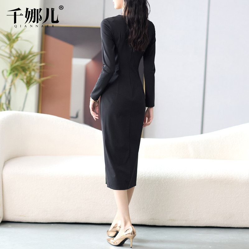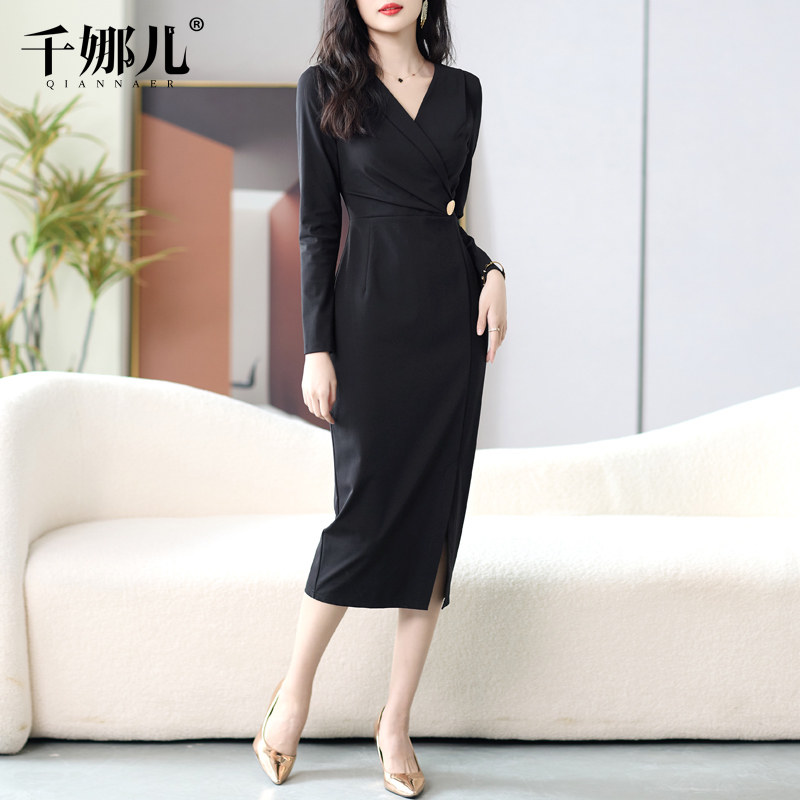 黑色长裙连衣裙春装2026新款长袖V领高端气质修身显瘦包臀长款裙