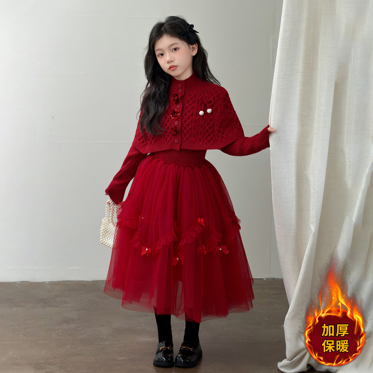 女童连衣裙拜年服2026新款冬季女孩大童过年红色毛衣裙子儿童套装