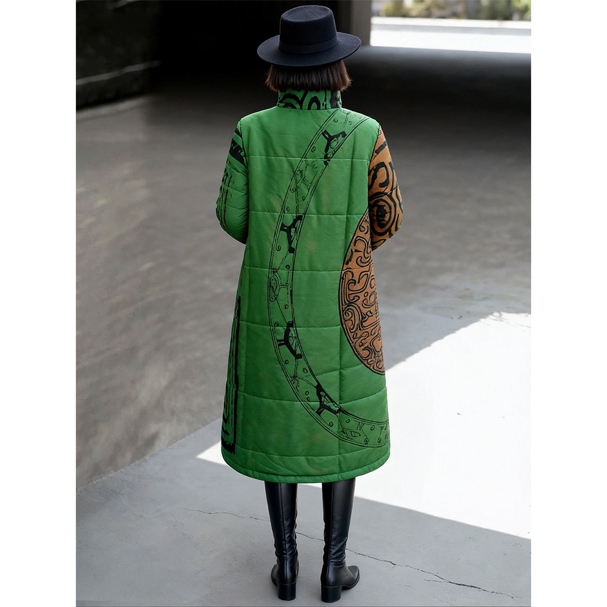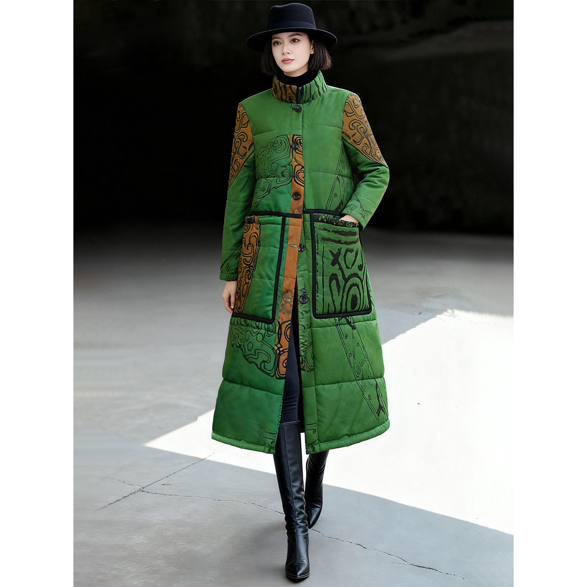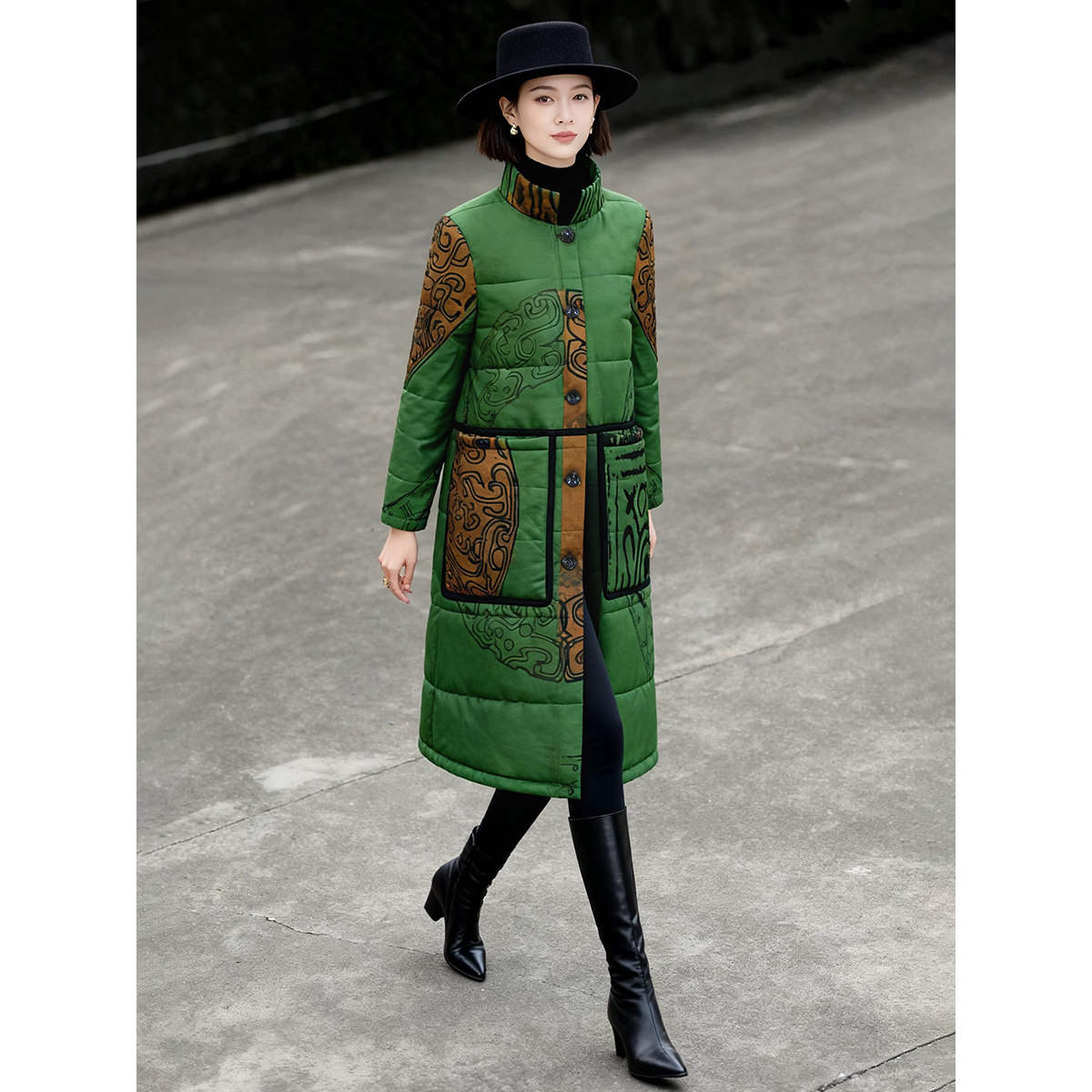 绿色印花棉服女款2025新款冬季夹棉中国民族风高个子印花大衣外套