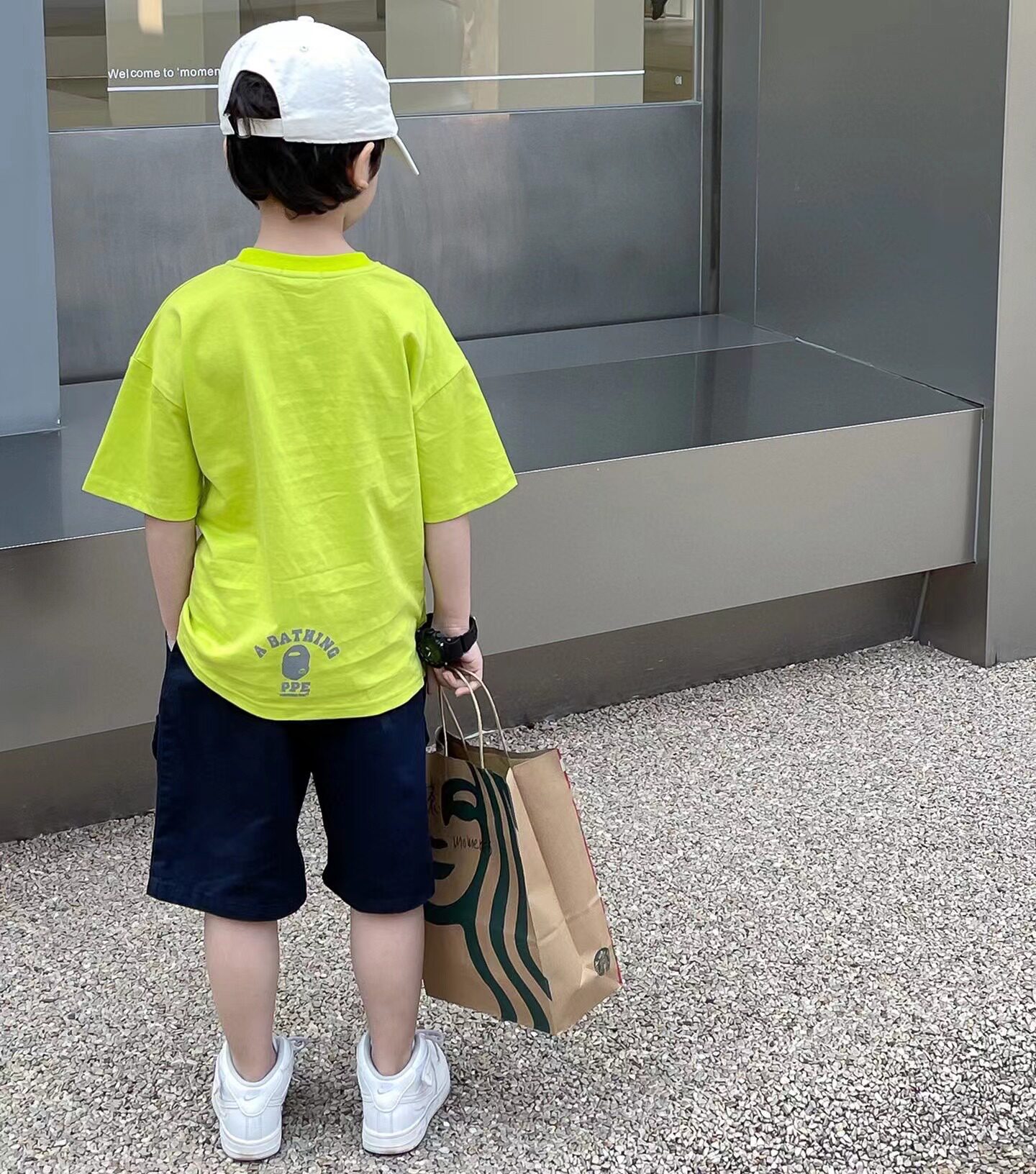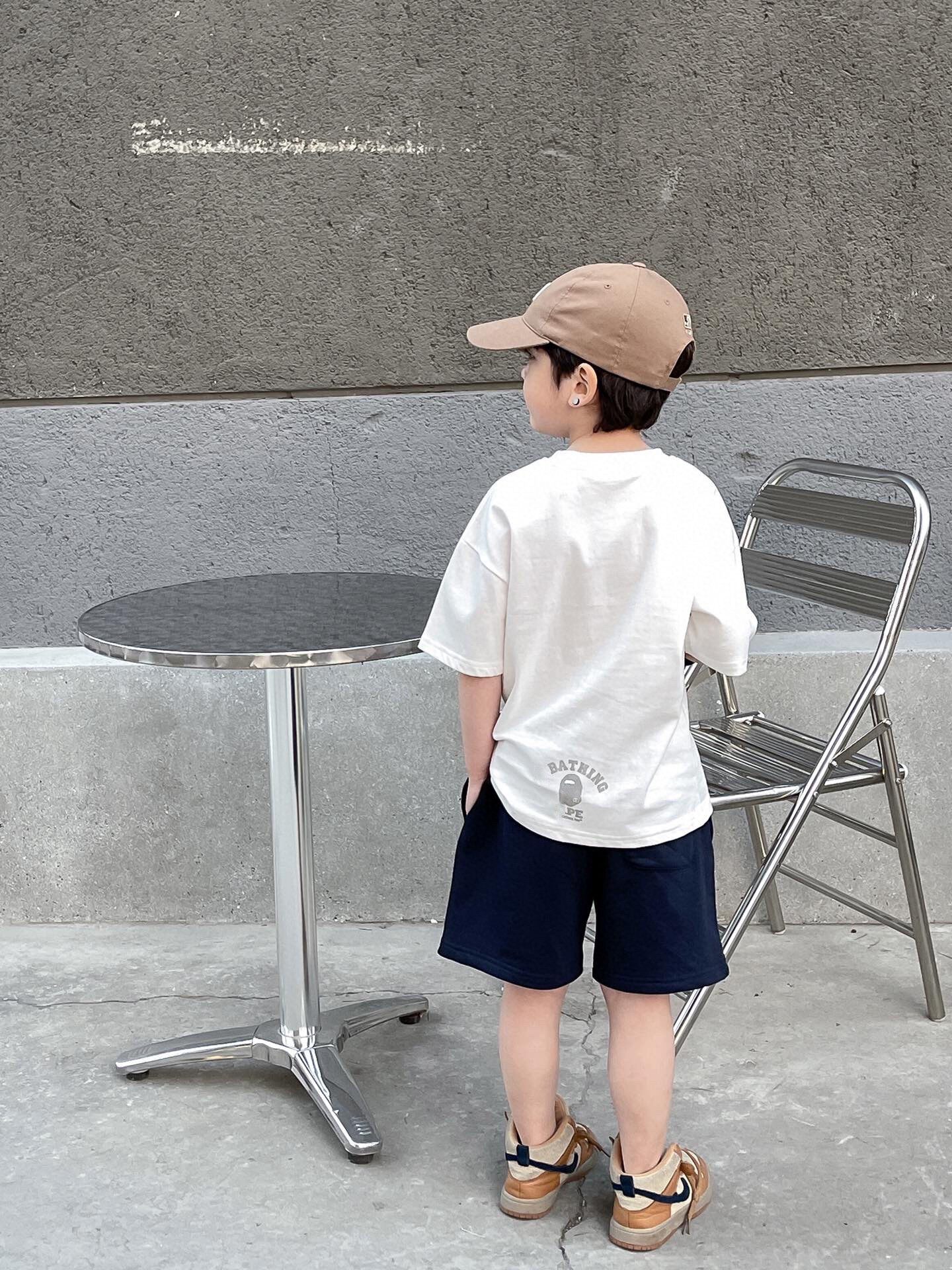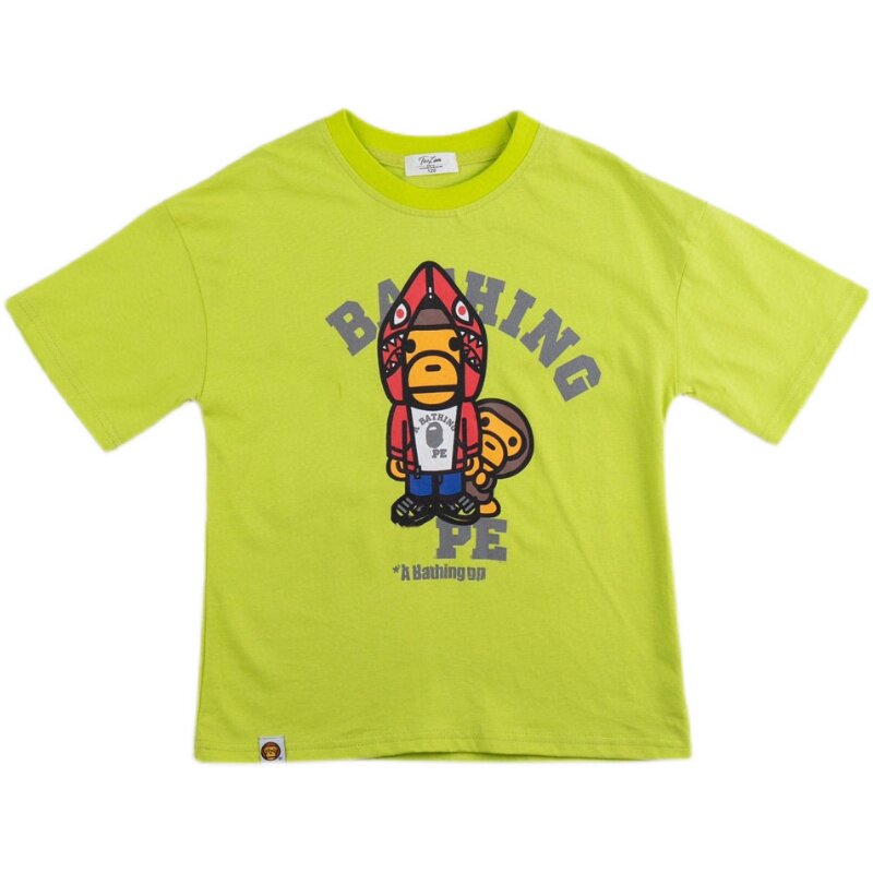 日系男童卡通印花t恤女宝宝荧光绿纯色显白短袖儿童薄款休闲上衣