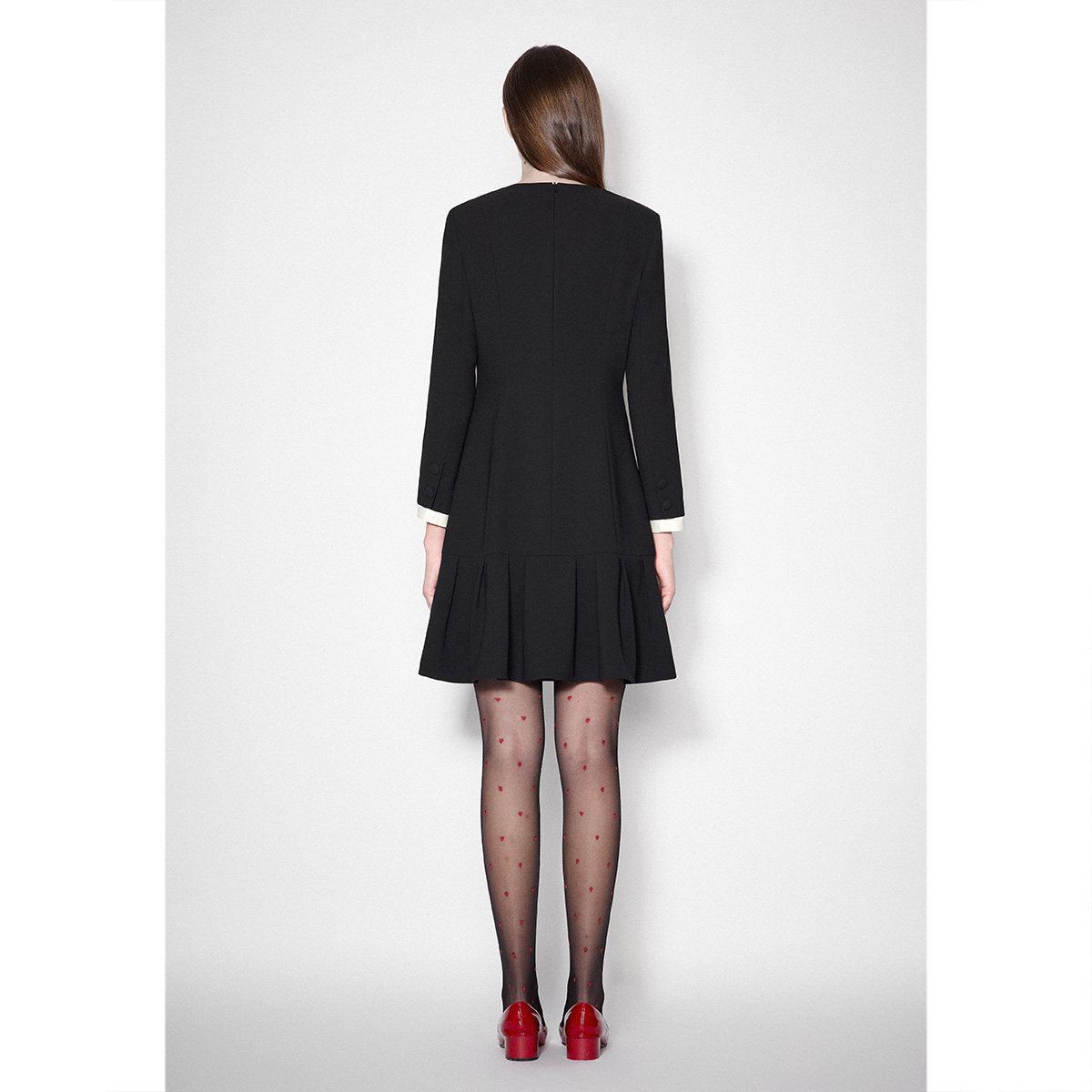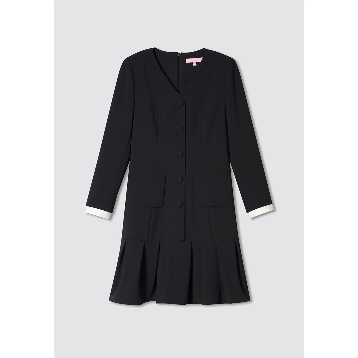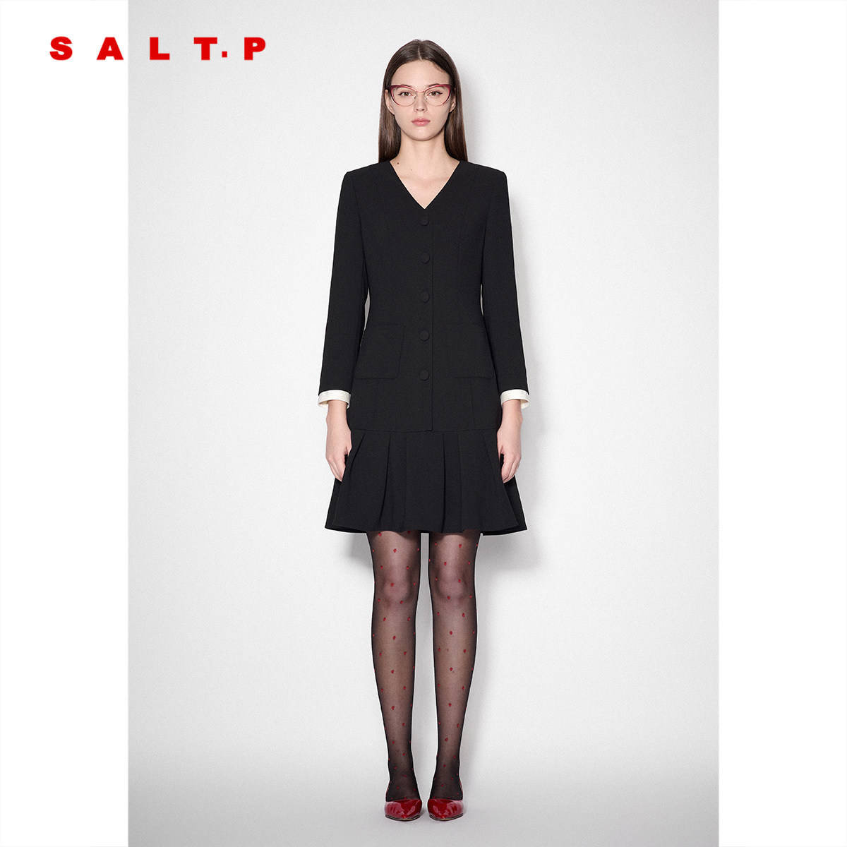 SALT.P可颜春季千金风法式v领长袖连衣裙短款拼接a字裙小黑裙