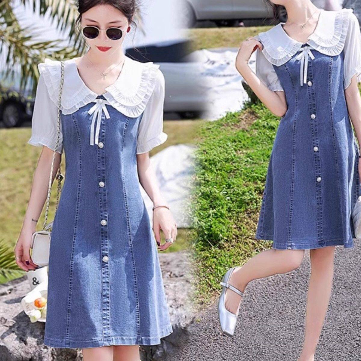 娃娃领拼接牛仔连衣裙女夏2025新款洋气减龄修身显瘦小个子a字裙
