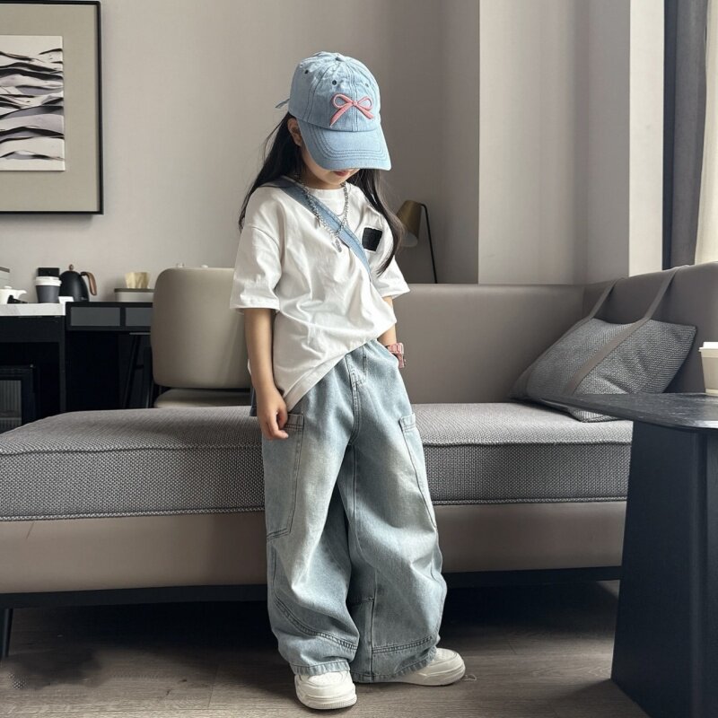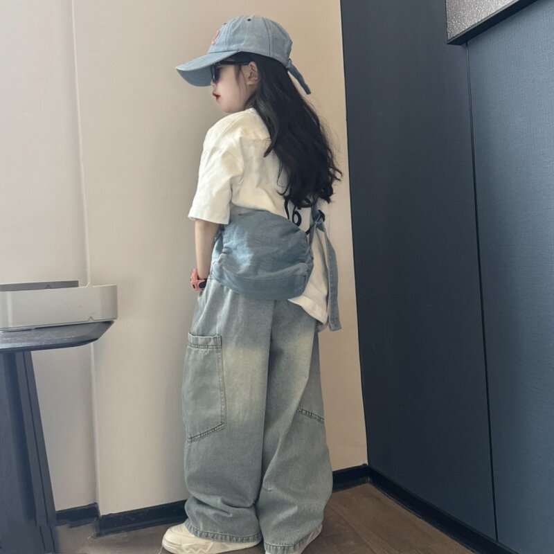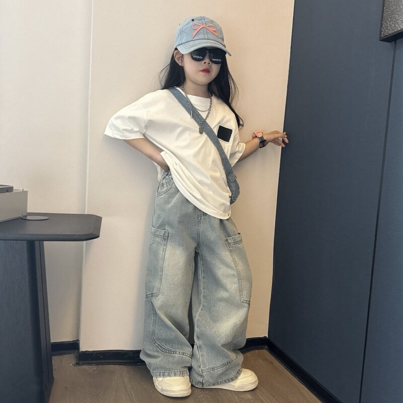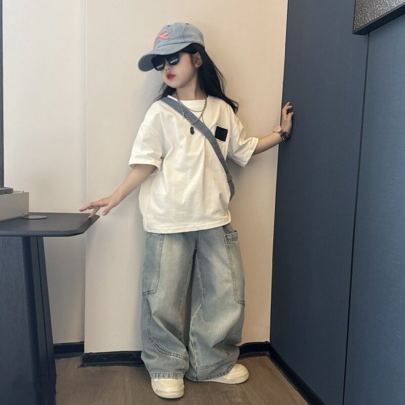 男女童潮酷夏季休闲宽松牛仔弯刀裤中大童洋气大版短袖T恤两件套