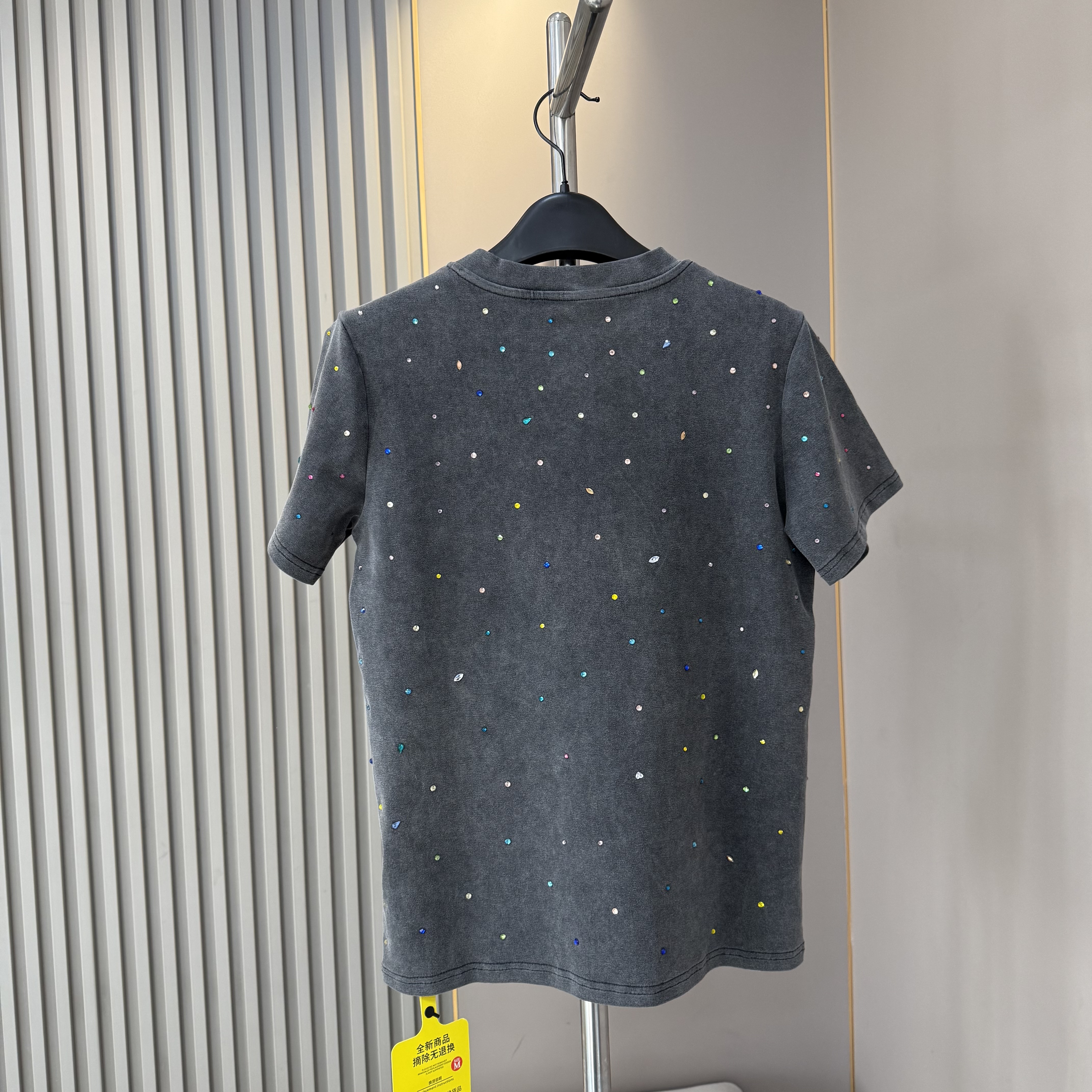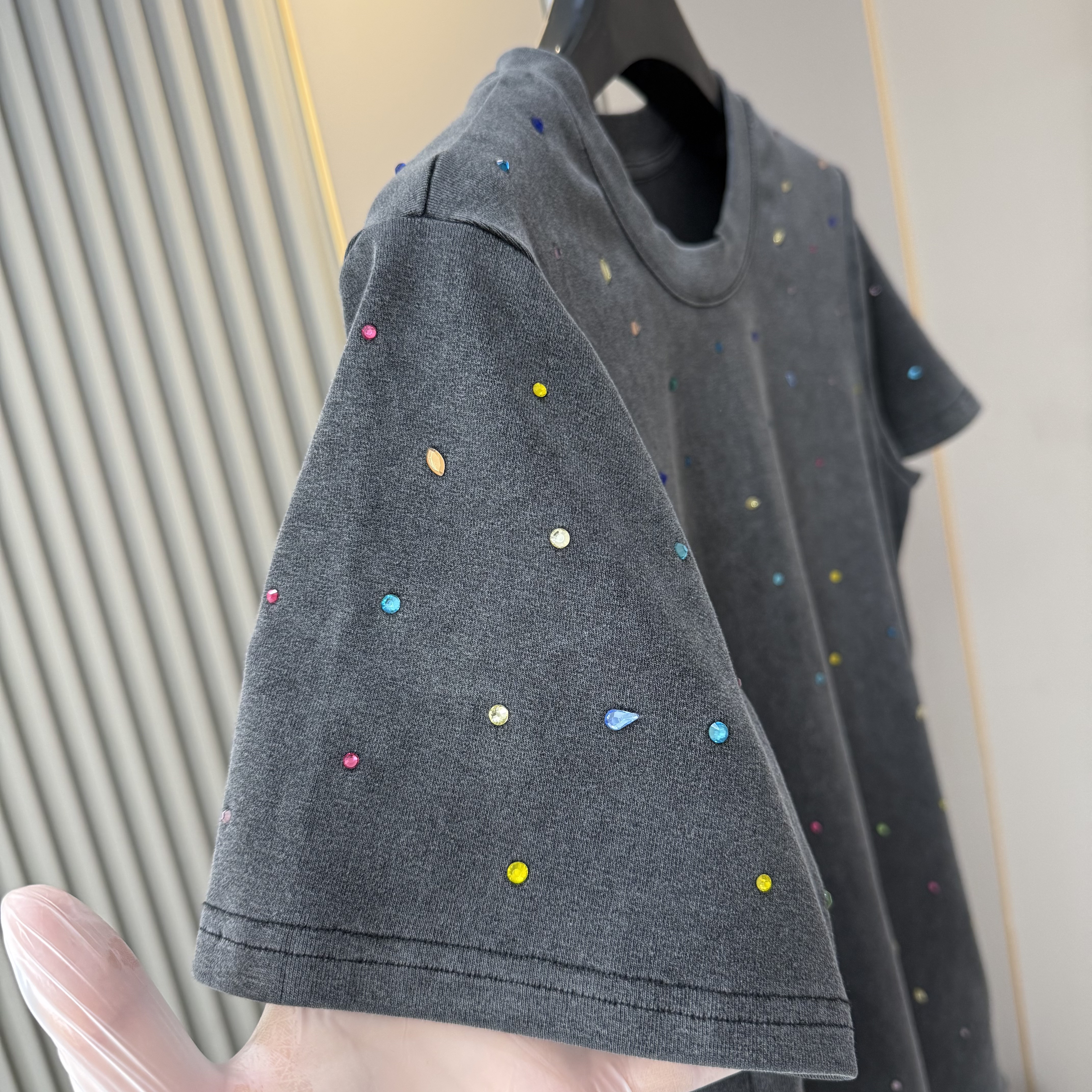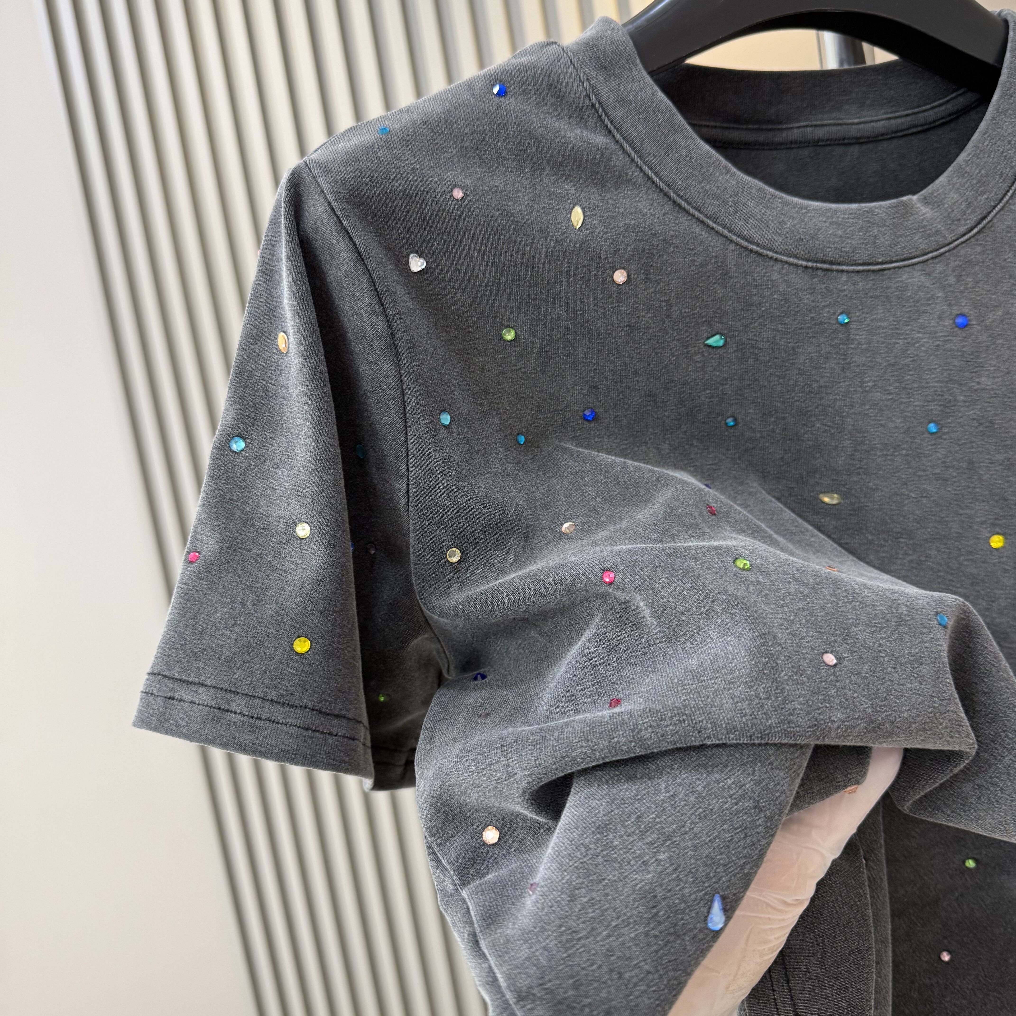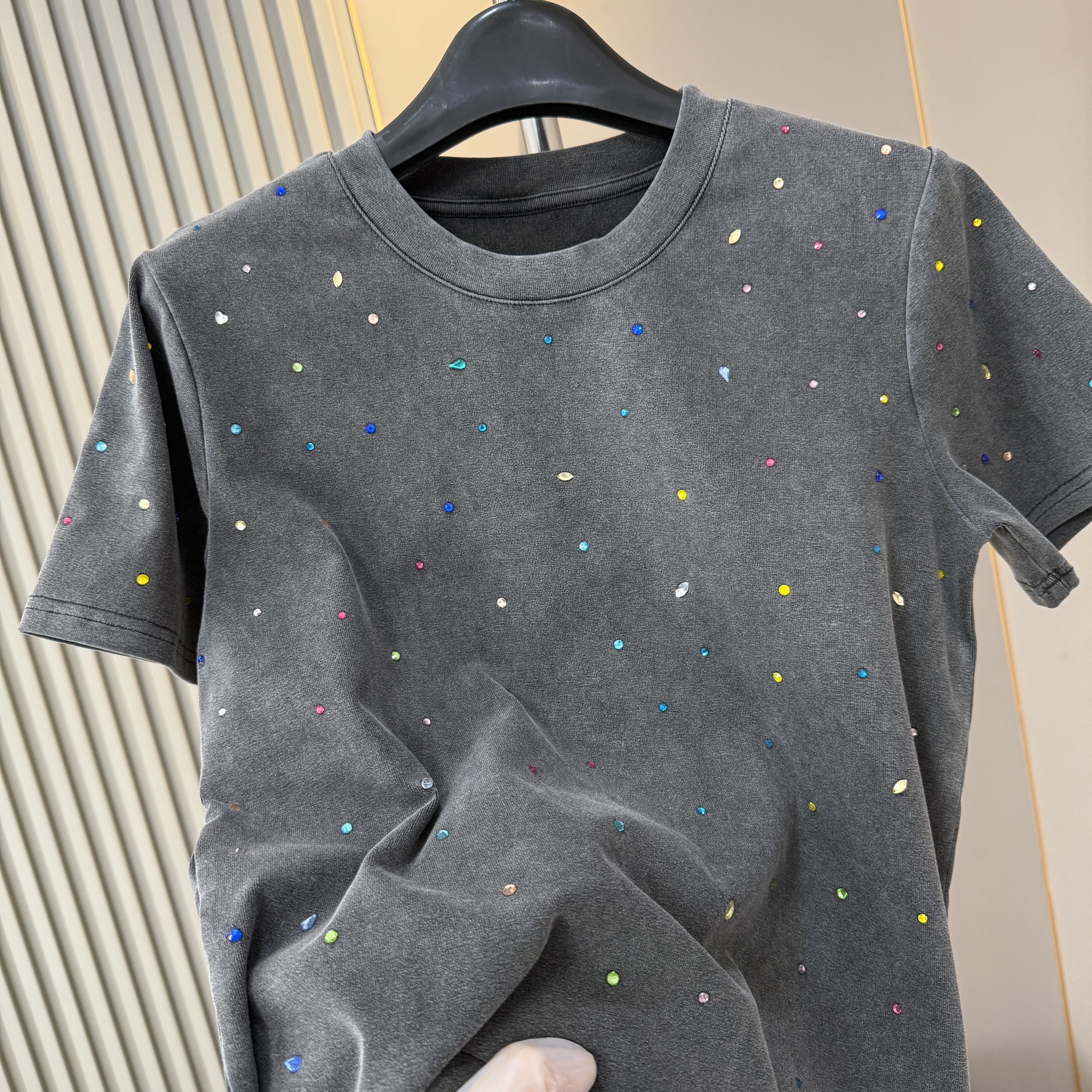 欧货2026早春新款时尚圆领重工多彩烫钻短袖T恤女做旧洋气上衣潮