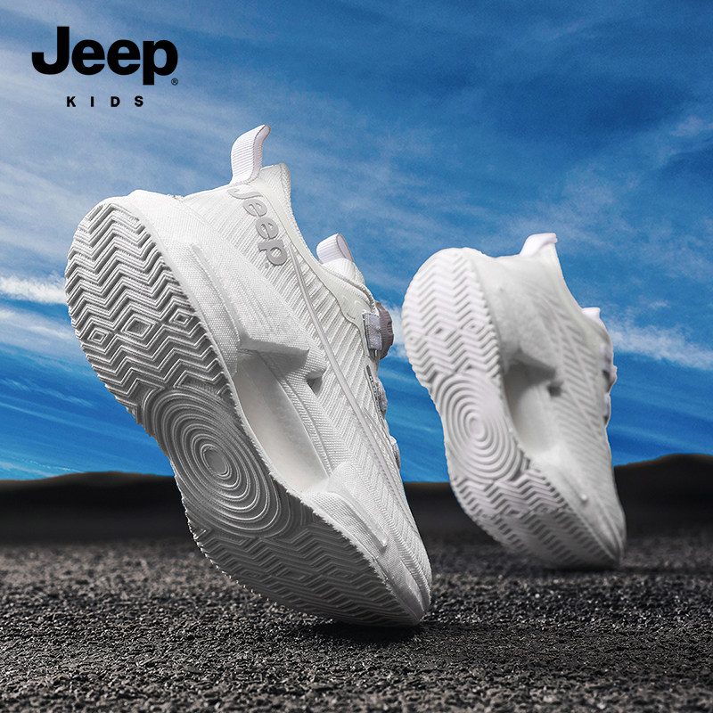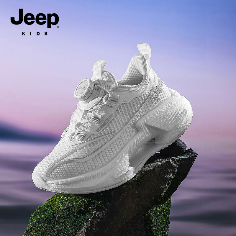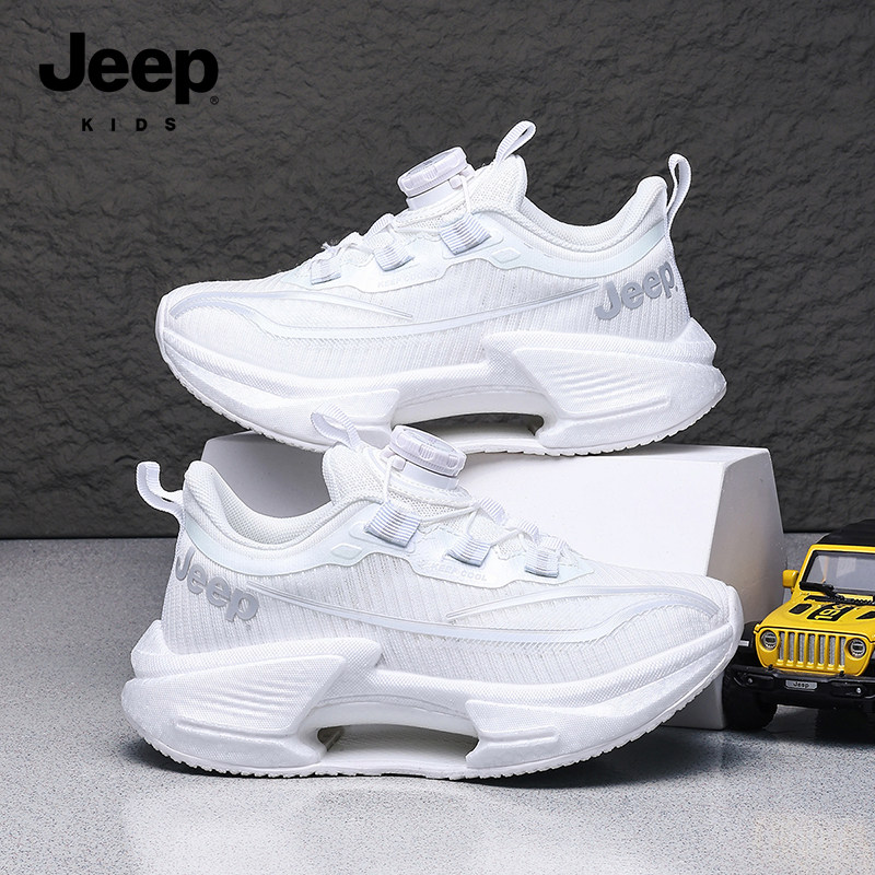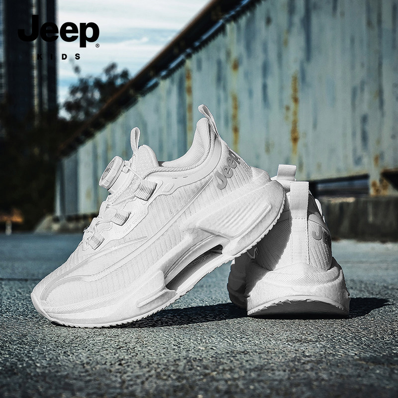 Jeep儿童小白鞋专业跑步鞋2026新款网面透气旋纽扣男童白色运动鞋