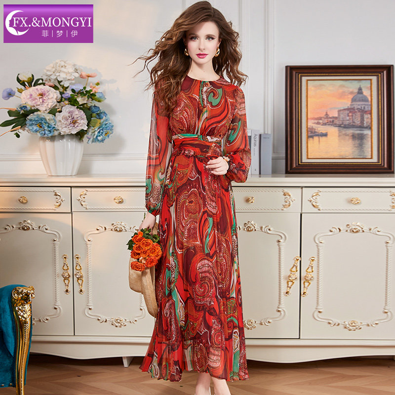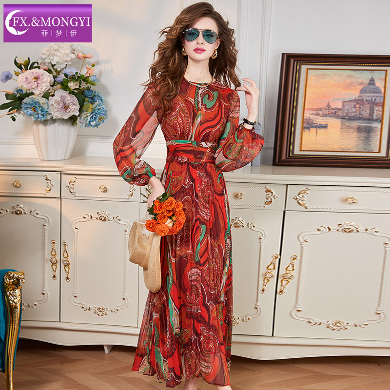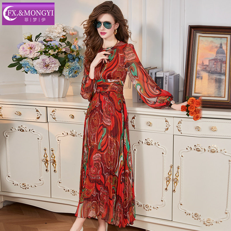菲梦伊印花连衣裙女长袖春装新款轻熟优雅收腰设计感圆领显瘦长裙