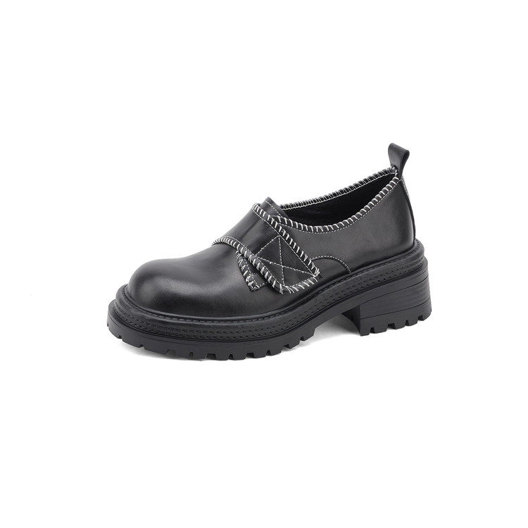黑色真皮圆头粗跟深口单鞋女2026春季新款时尚魔术贴乐福鞋子