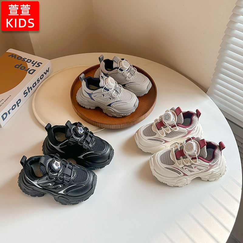 儿童免系带旋钮鞋黑色男童运动鞋网面透气女童鞋子春款宝宝网鞋潮