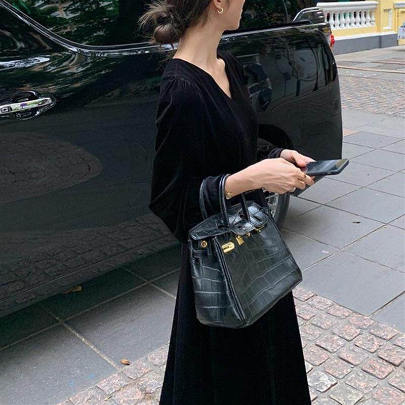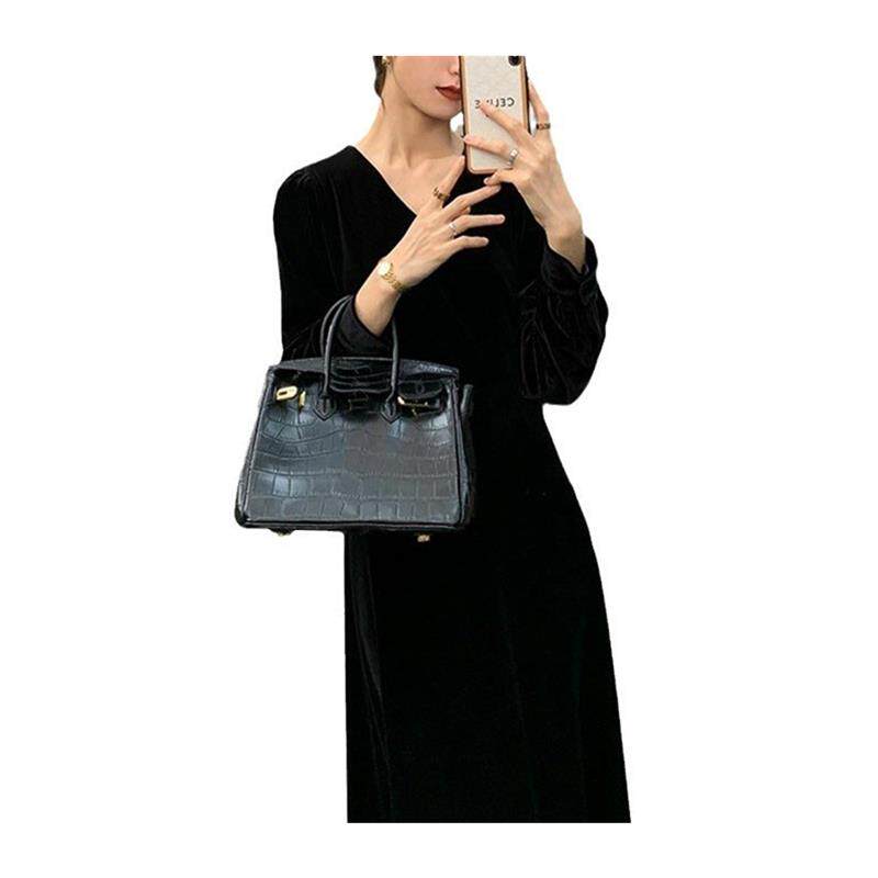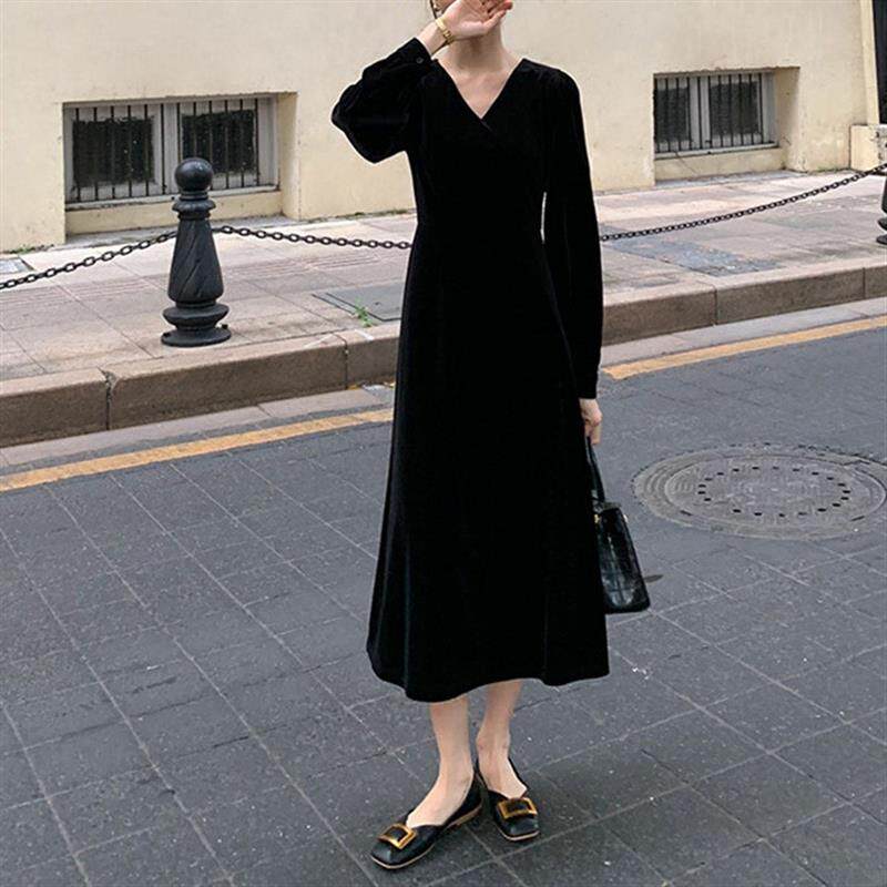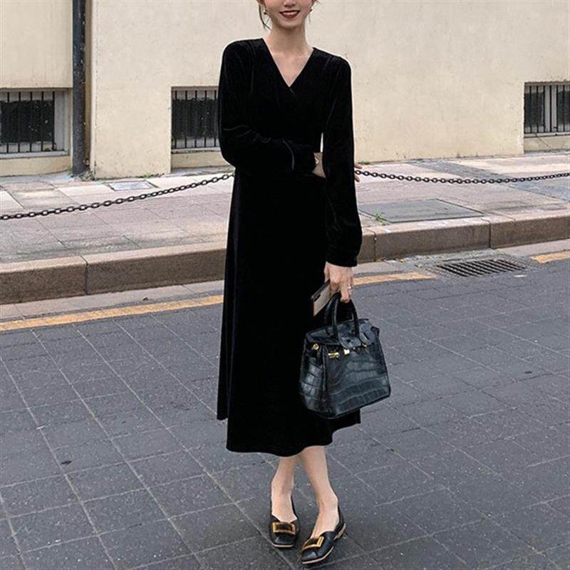 法式赫本风长袖连衣裙女2025春秋v领气质收腰显瘦中长款小黑裙