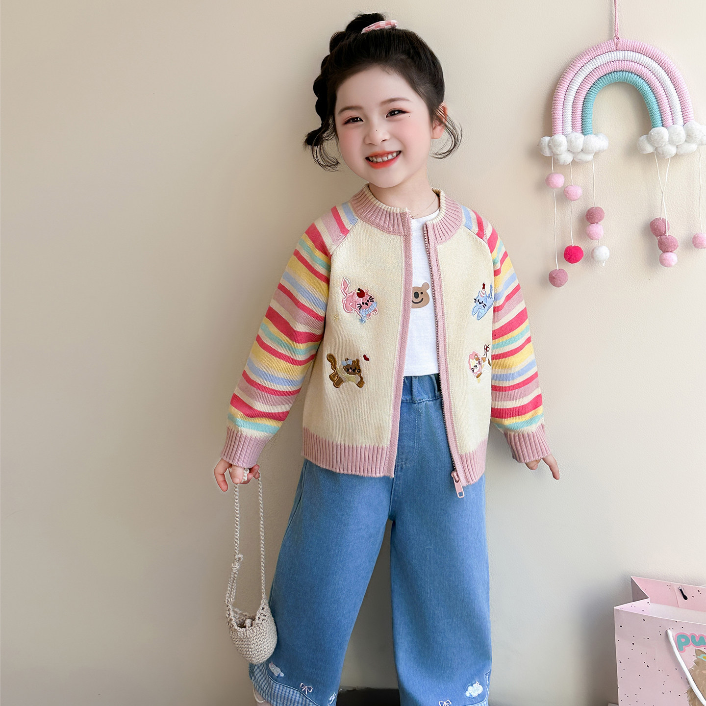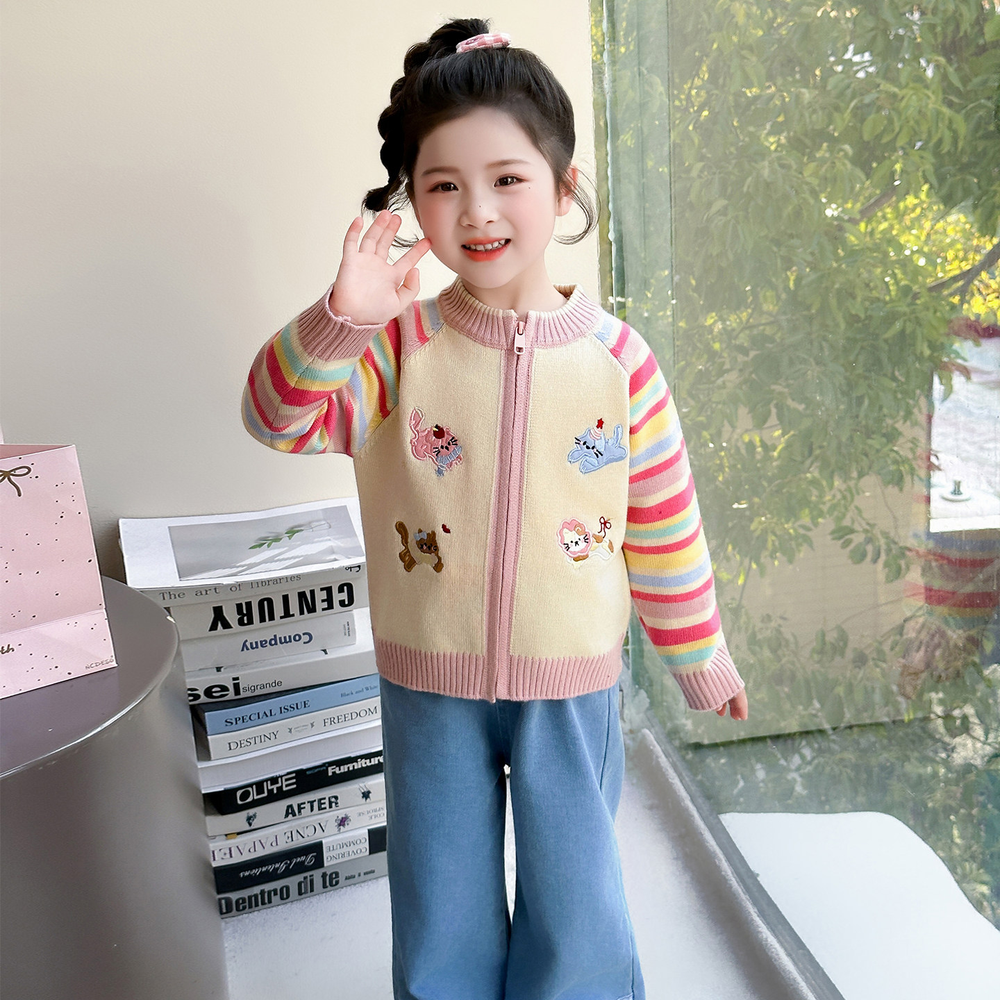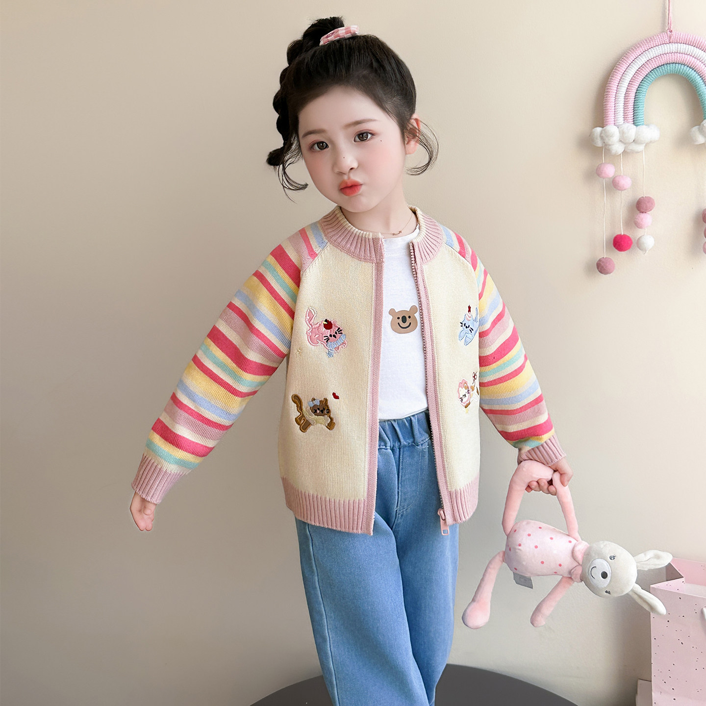 女童条纹开衫毛衣春季2026新款女宝宝儿童春装外套休闲拉链上衣