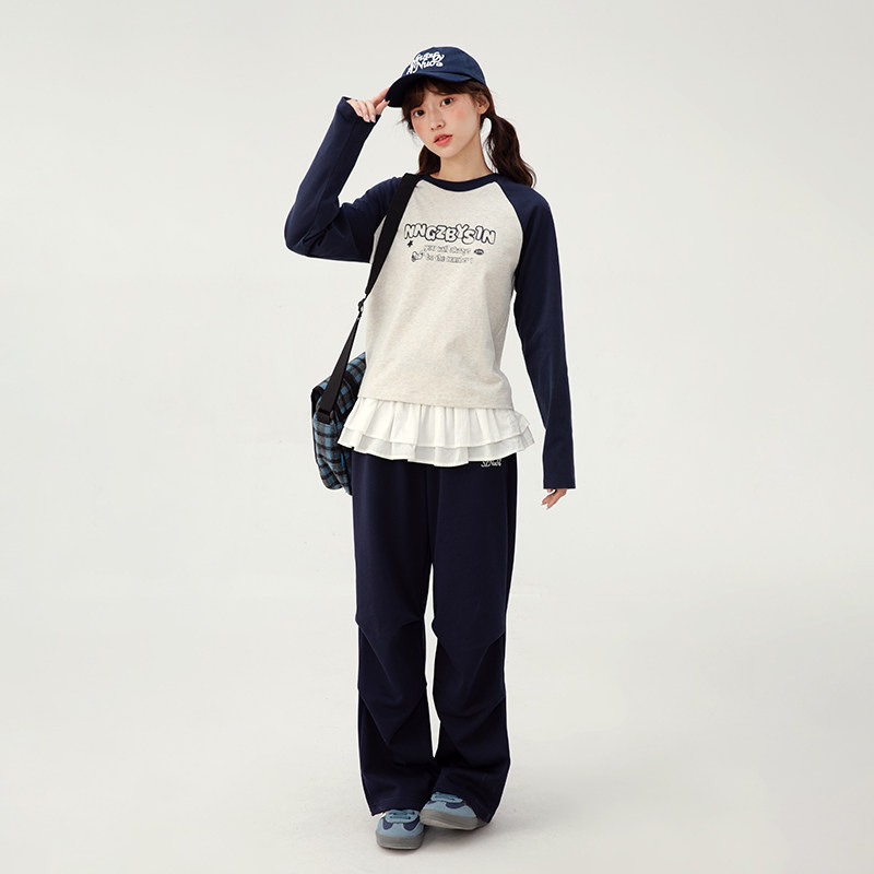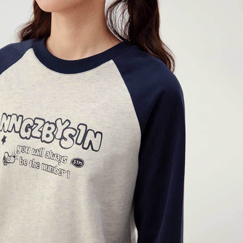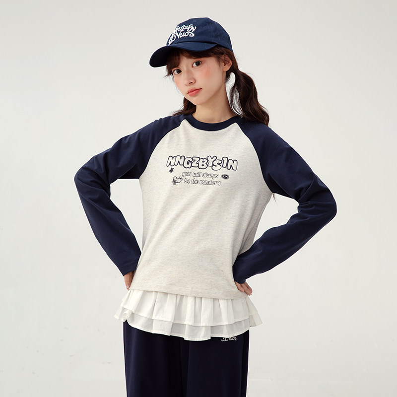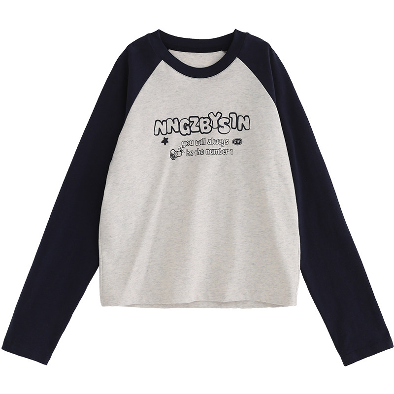 诺诺公主S1N初中生圆领长袖T恤女春秋韩系休闲撞色字母插肩袖上衣