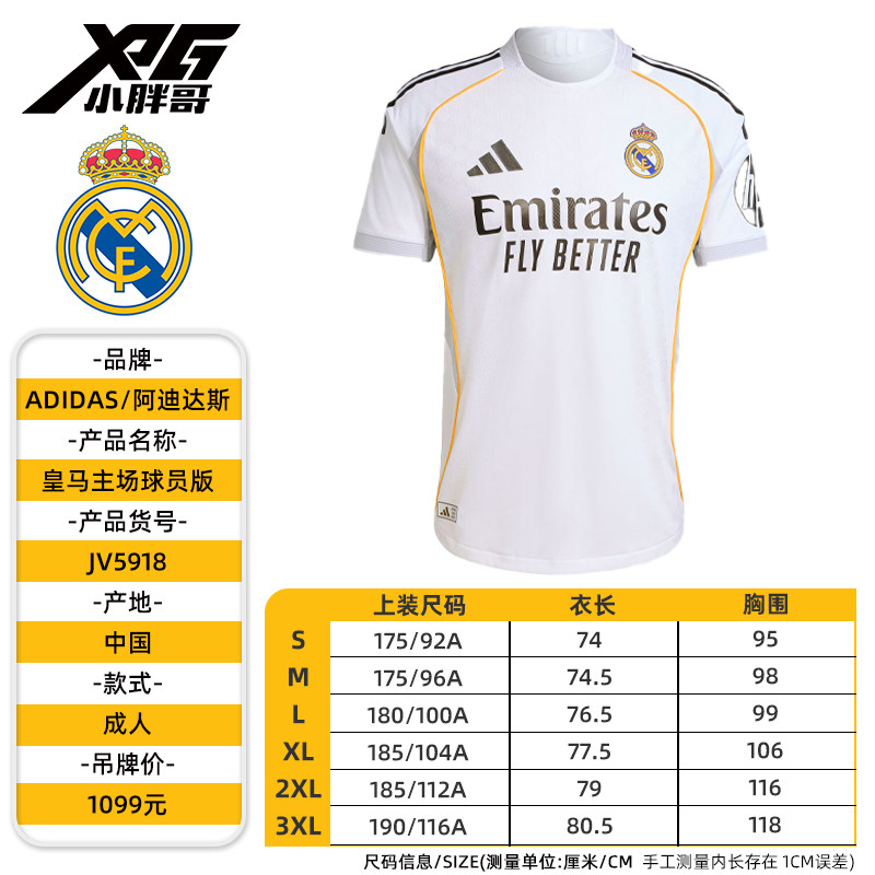 小胖哥XPG阿迪达斯25/26皇马球员版主场短袖球衣比赛训练足球服男