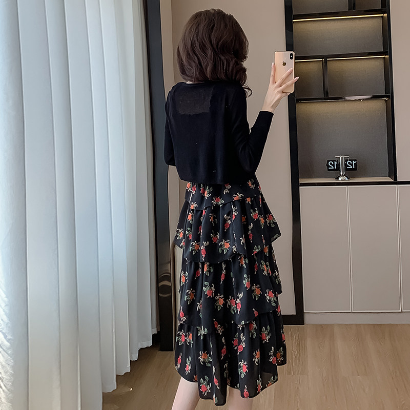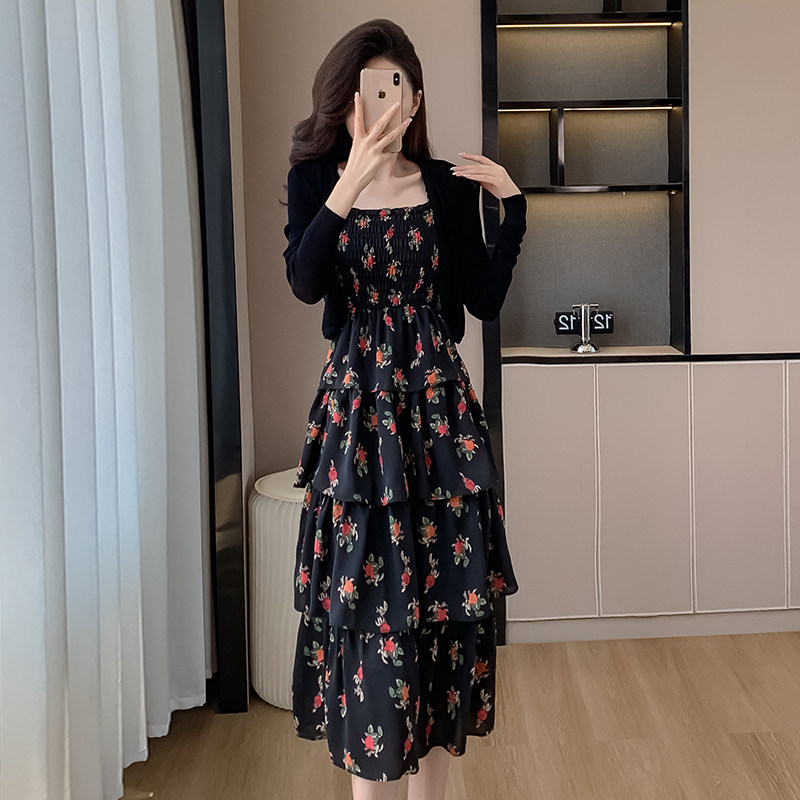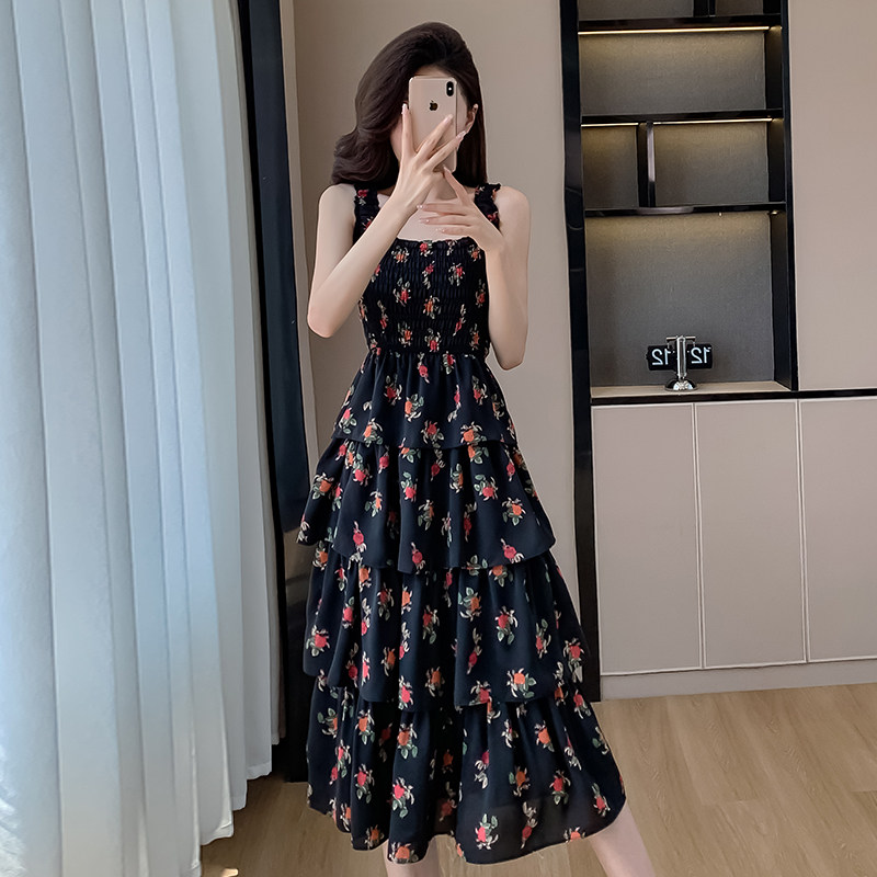 法式黑色玫瑰碎花吊带连衣裙女夏季收腰两件套小众蛋糕裙长款