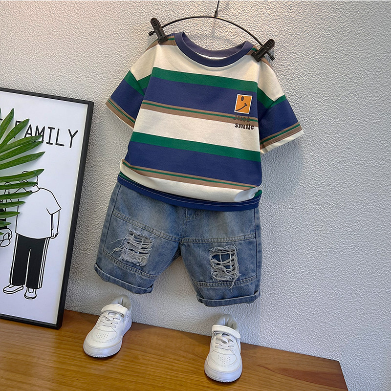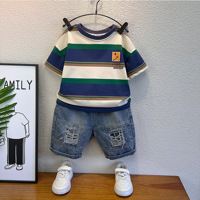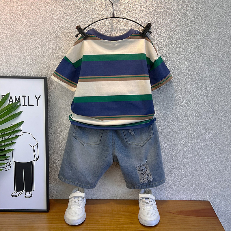 痞帅男童装宝宝夏季薄款套装2026新款儿童夏装条纹短袖t恤潮衣服