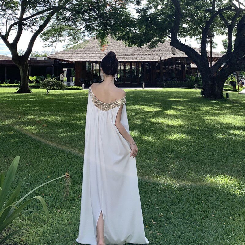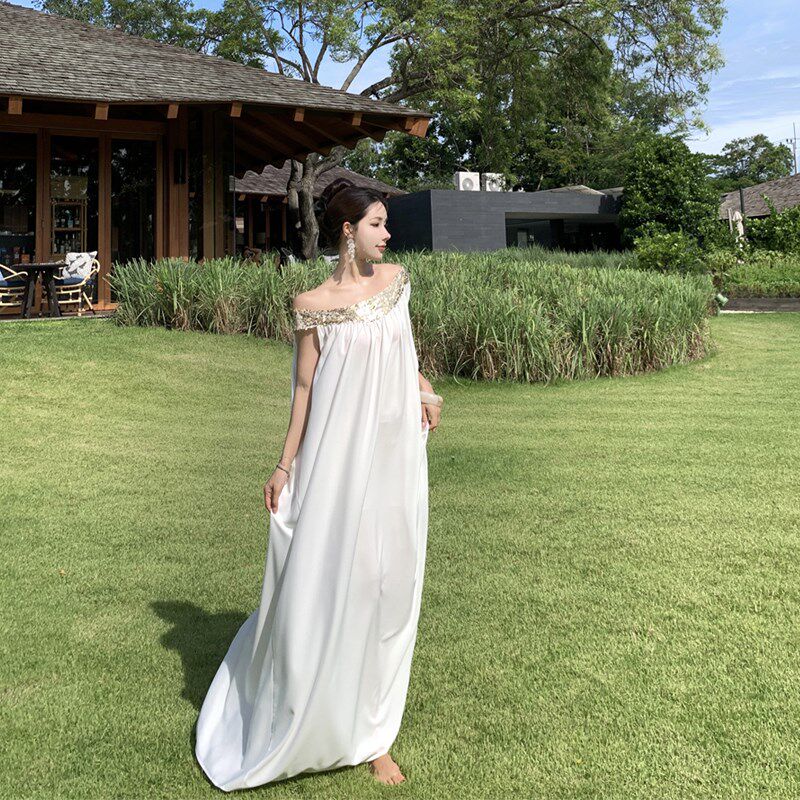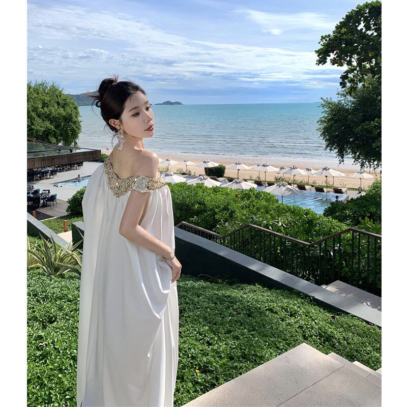 新品一字领连衣裙夏季小众设计感宽松F无袖亮片抹胸长裙白色大码