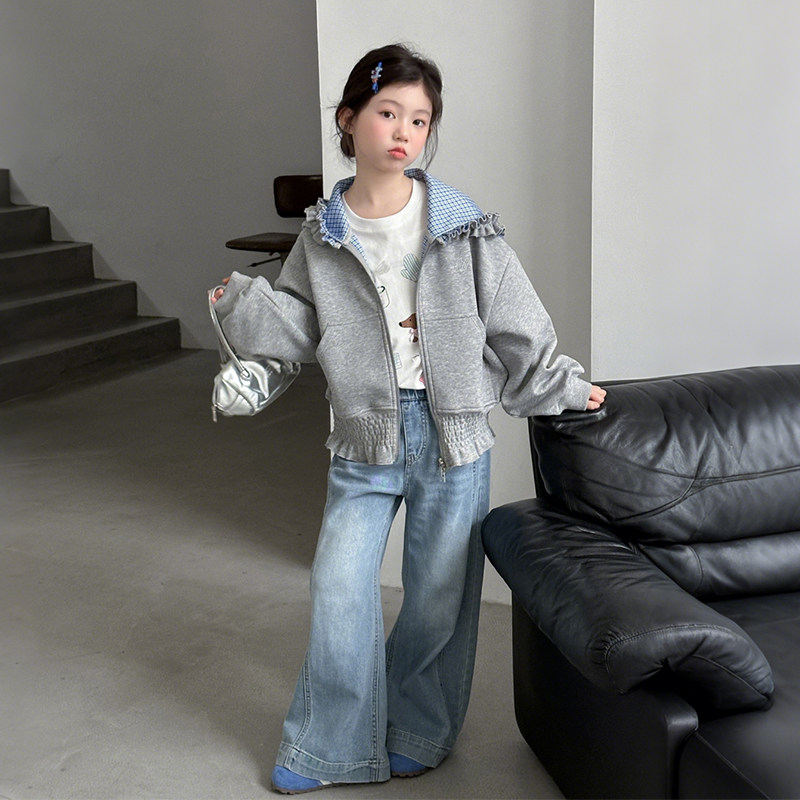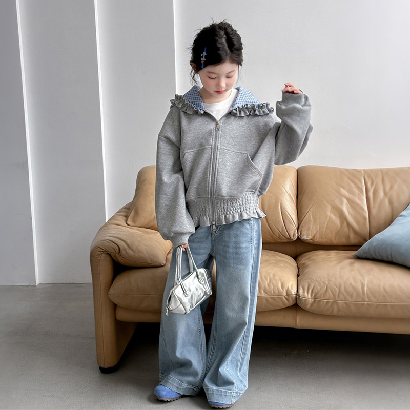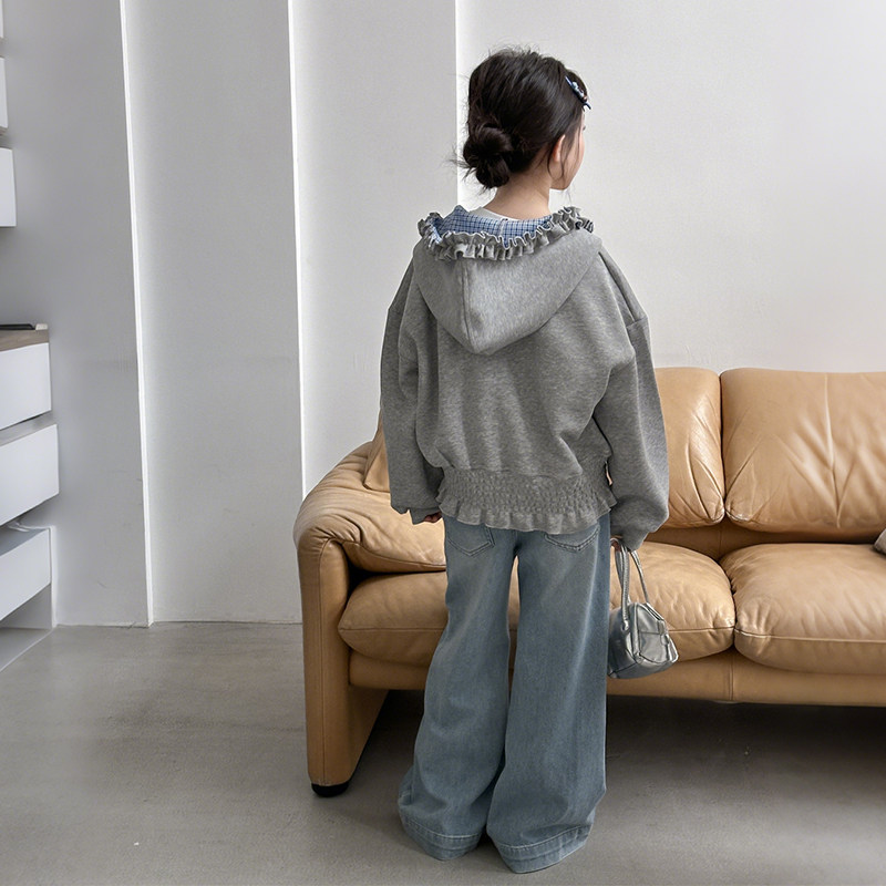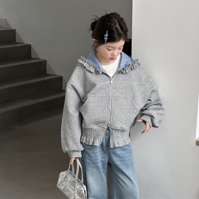女童春装连帽外套2026新款儿童开衫卫衣大童女孩春季时尚花边上衣