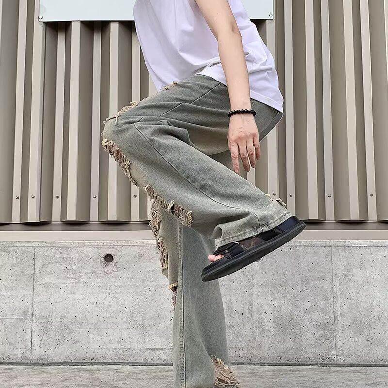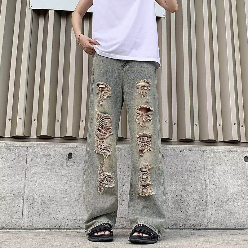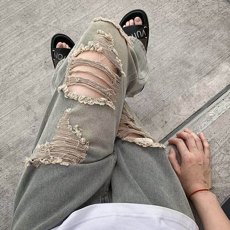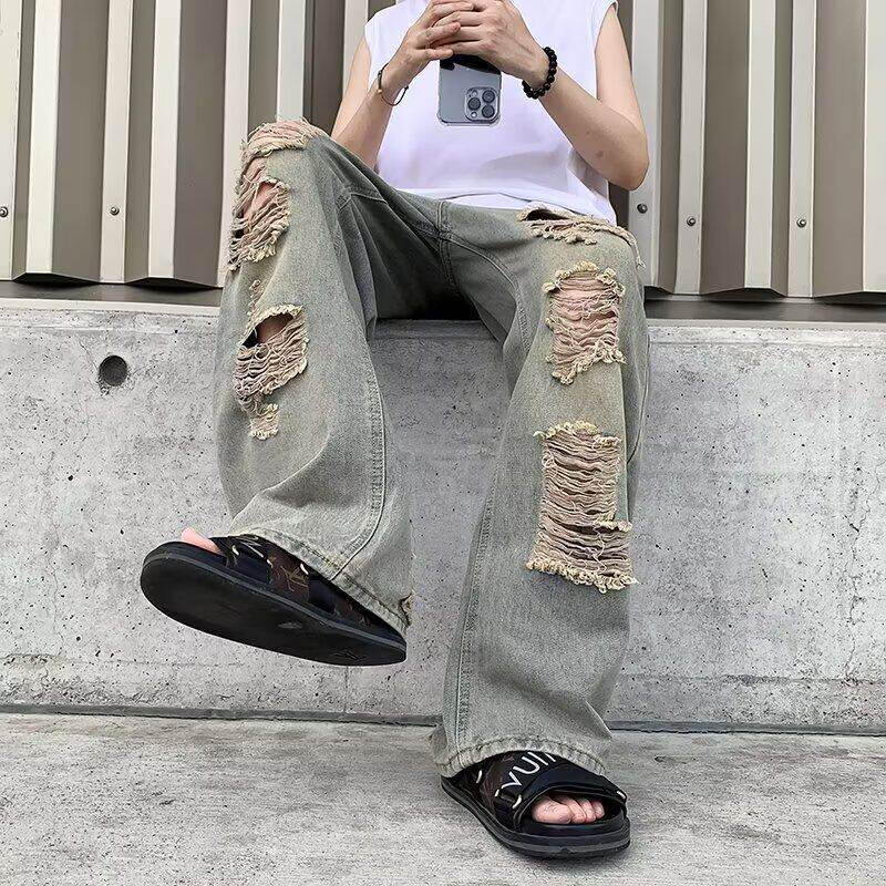 2026夏季新款破洞牛仔裤男款复古小众设计垂感显瘦直筒乞丐长裤子