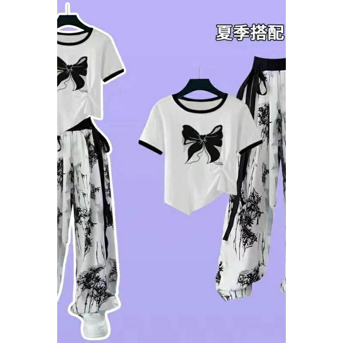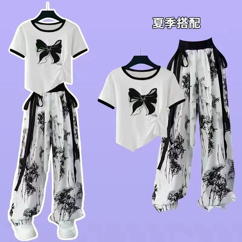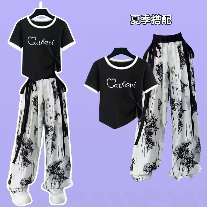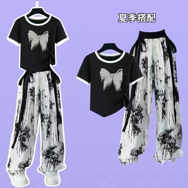 潮流短袖t恤女童2026新款夏季超好看套装中大童拼色上衣冰丝裤子