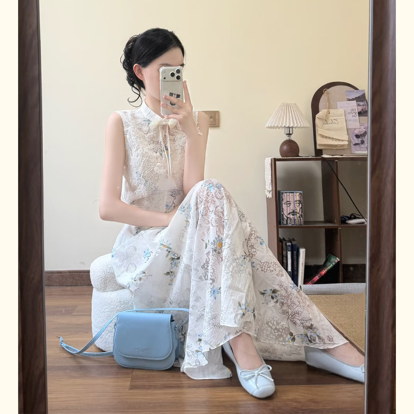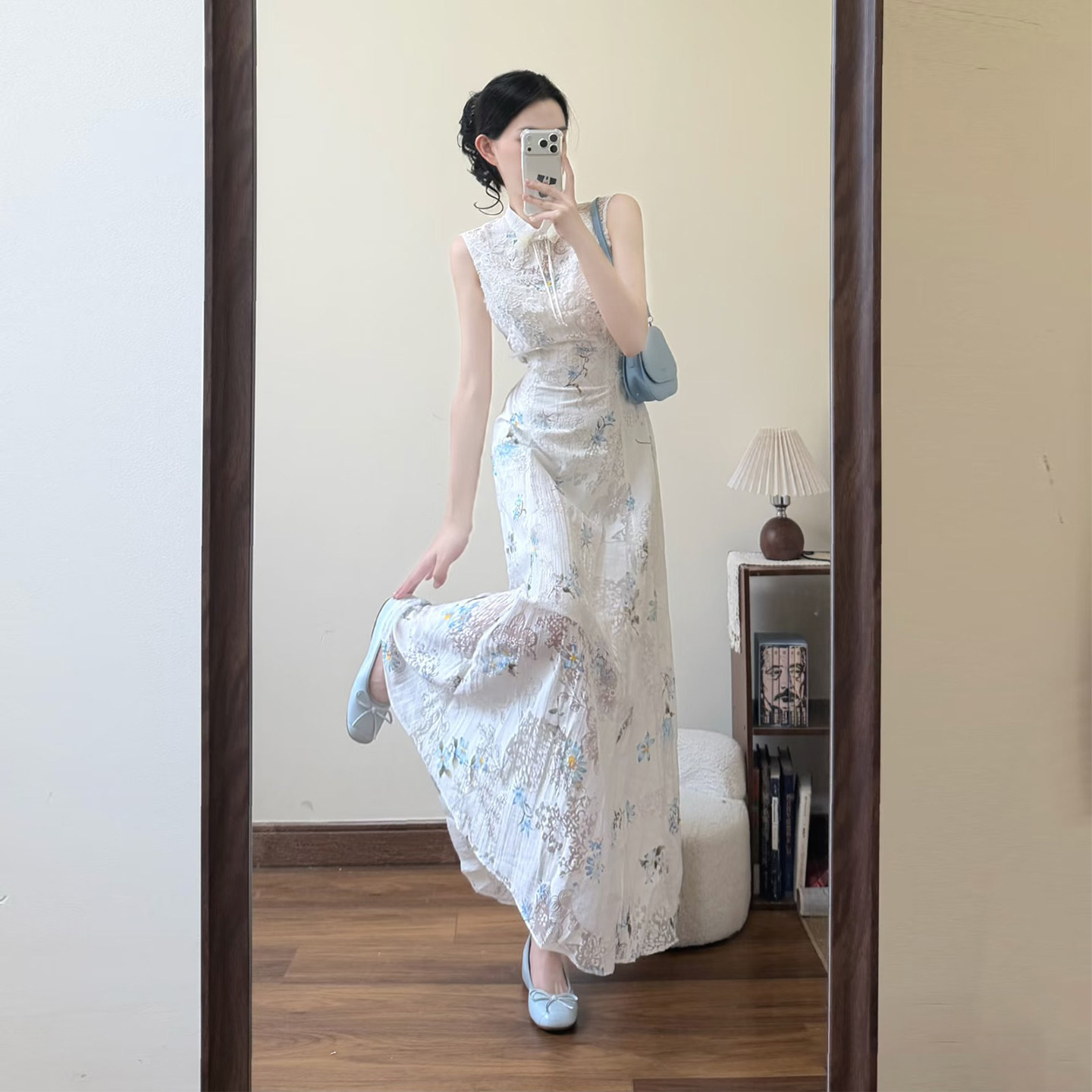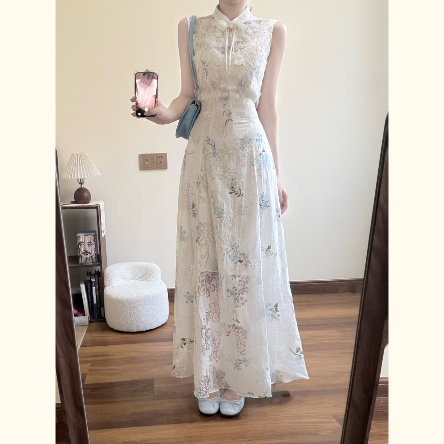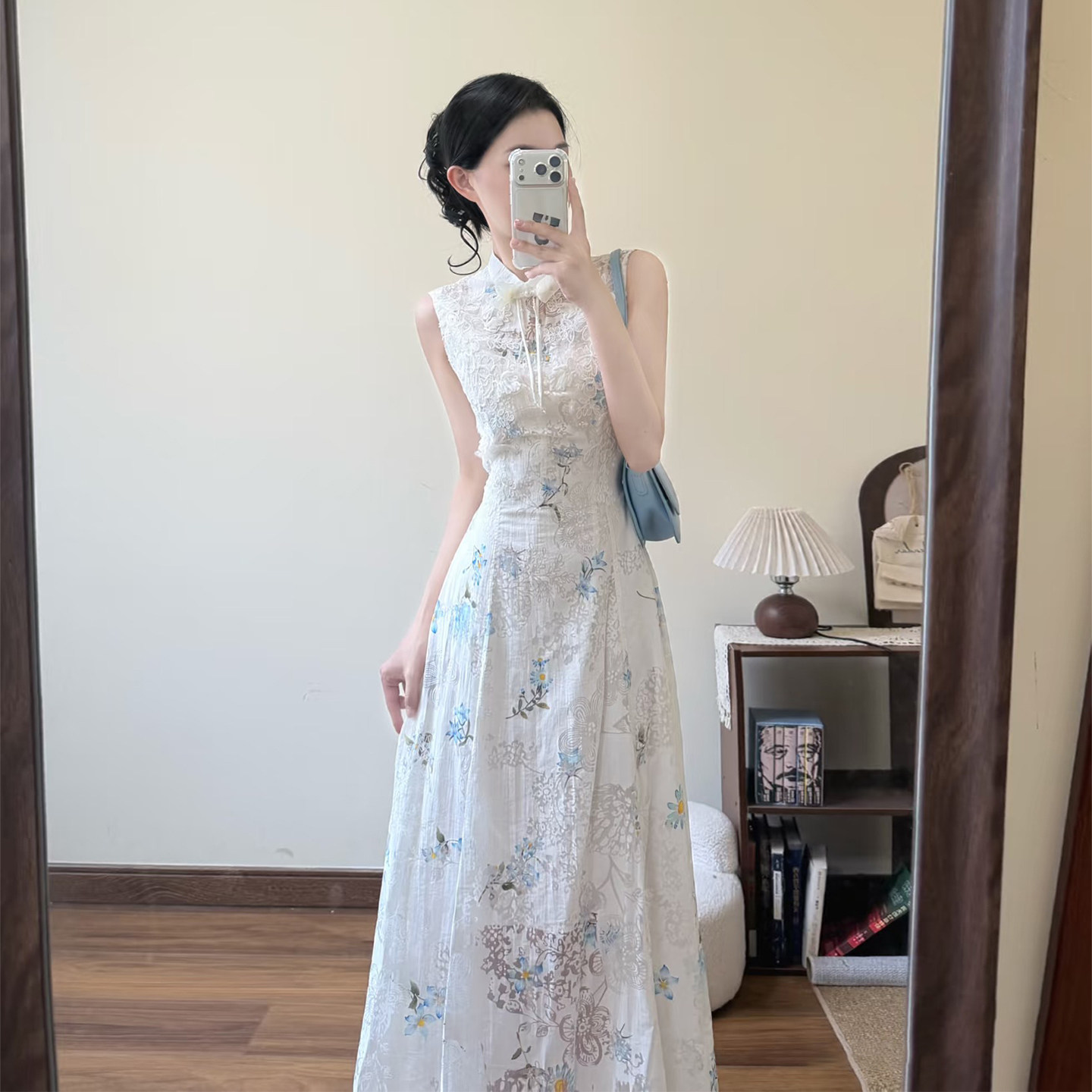 国风改良旗袍连衣裙 日常通勤约会穿 气质蓝白碎花无袖长裙