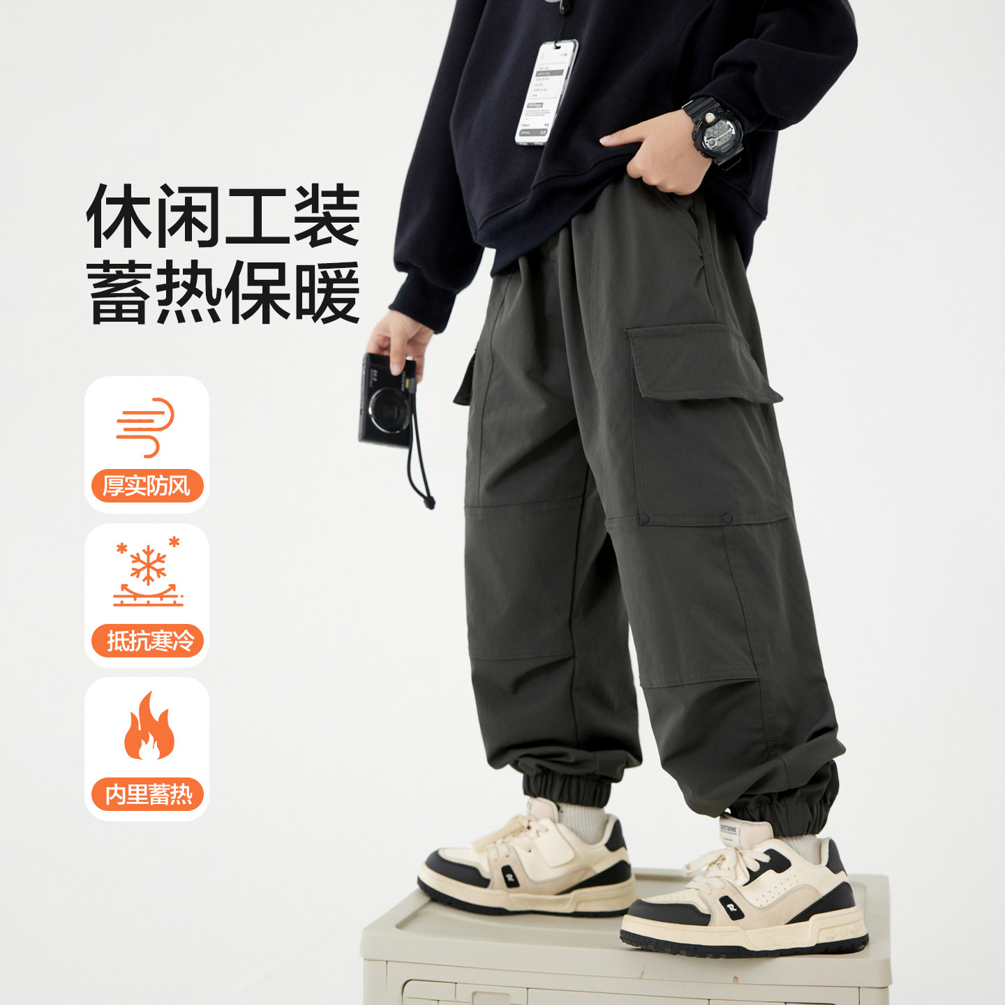 男童秋冬潮牌加绒运动工装裤2025新款青少年儿童加厚防风直筒裤子