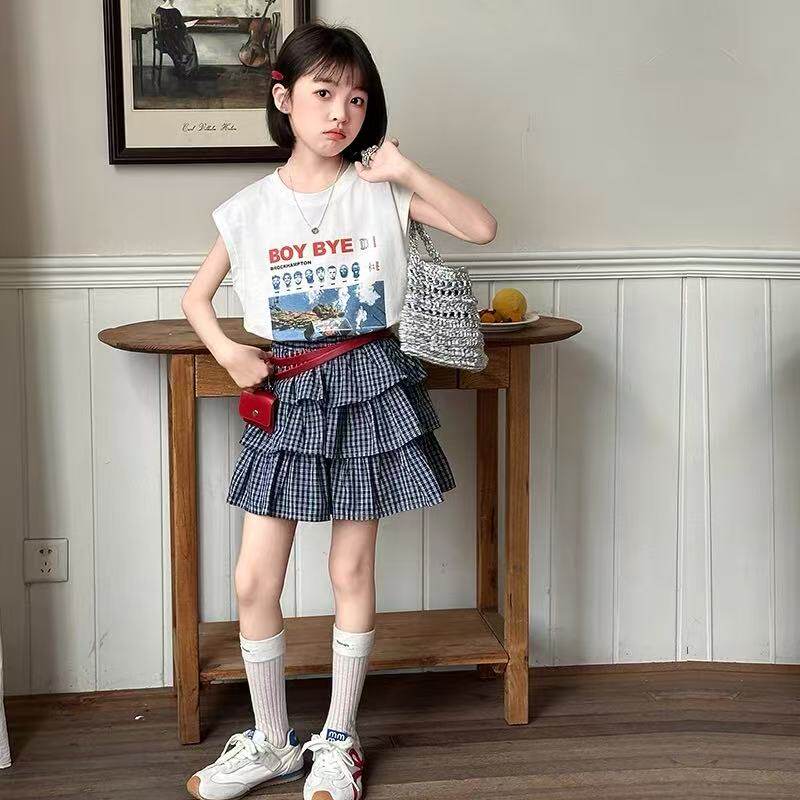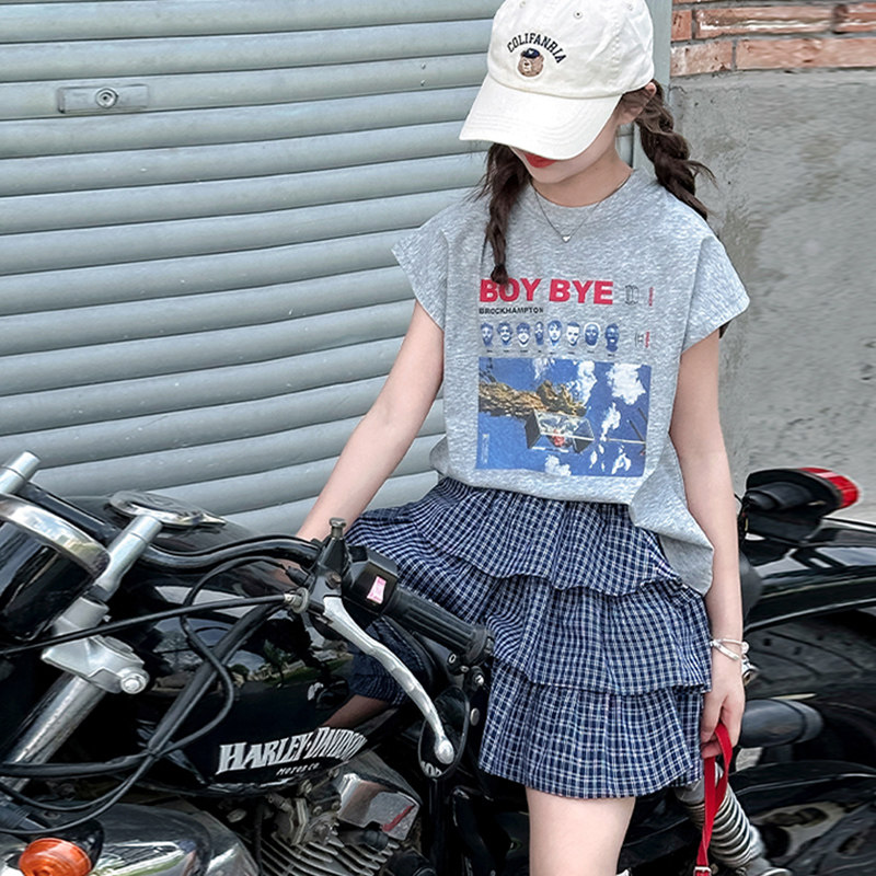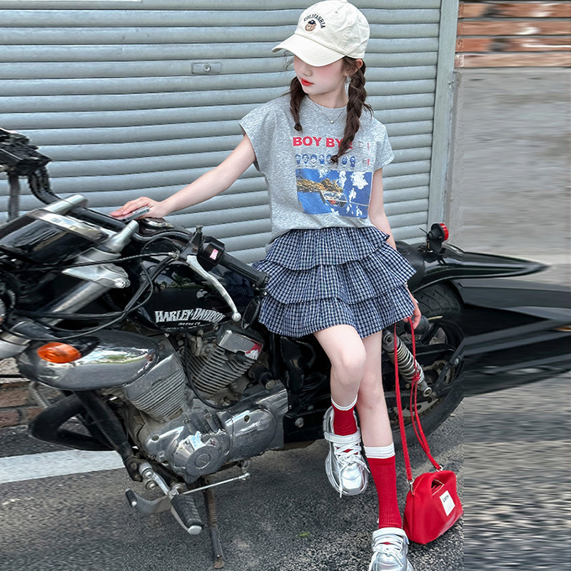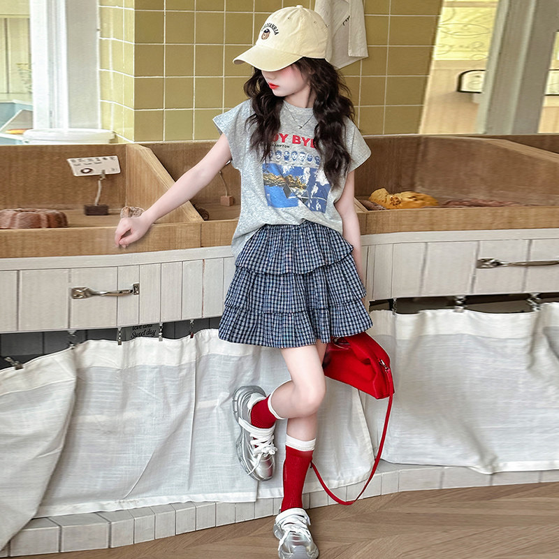 女童套装夏款儿童短袖T恤格子短裙两件套中大童装半身裙时尚新款