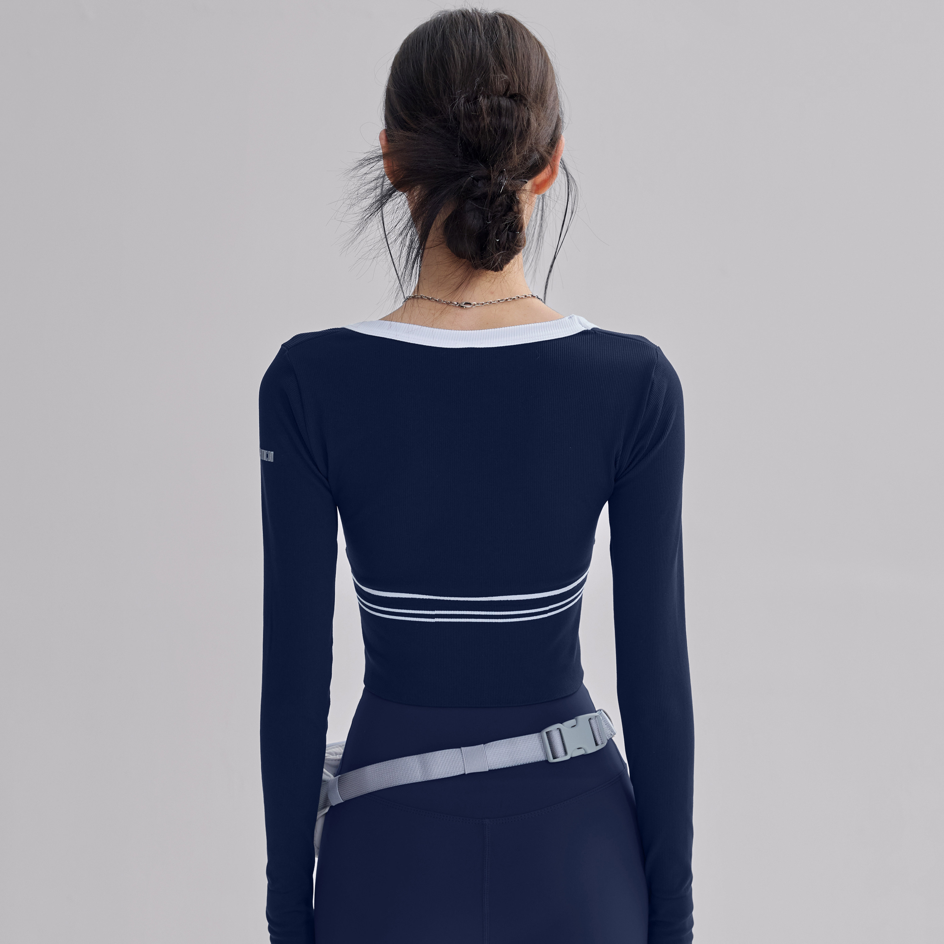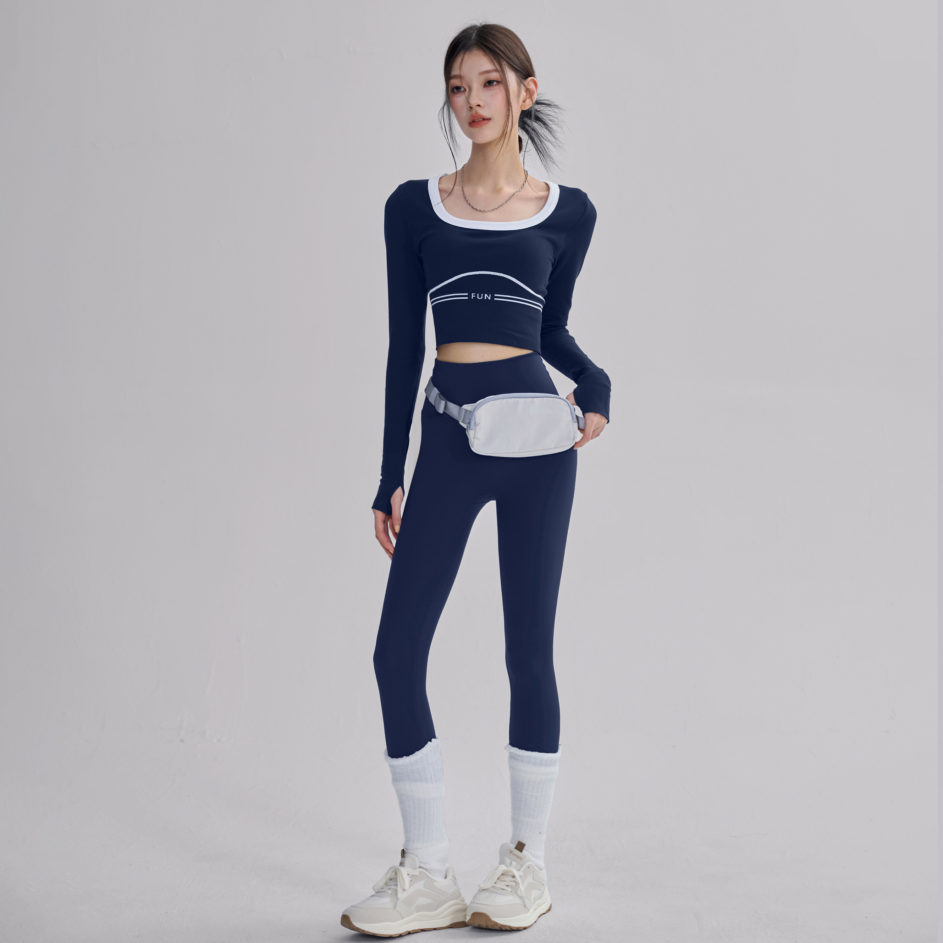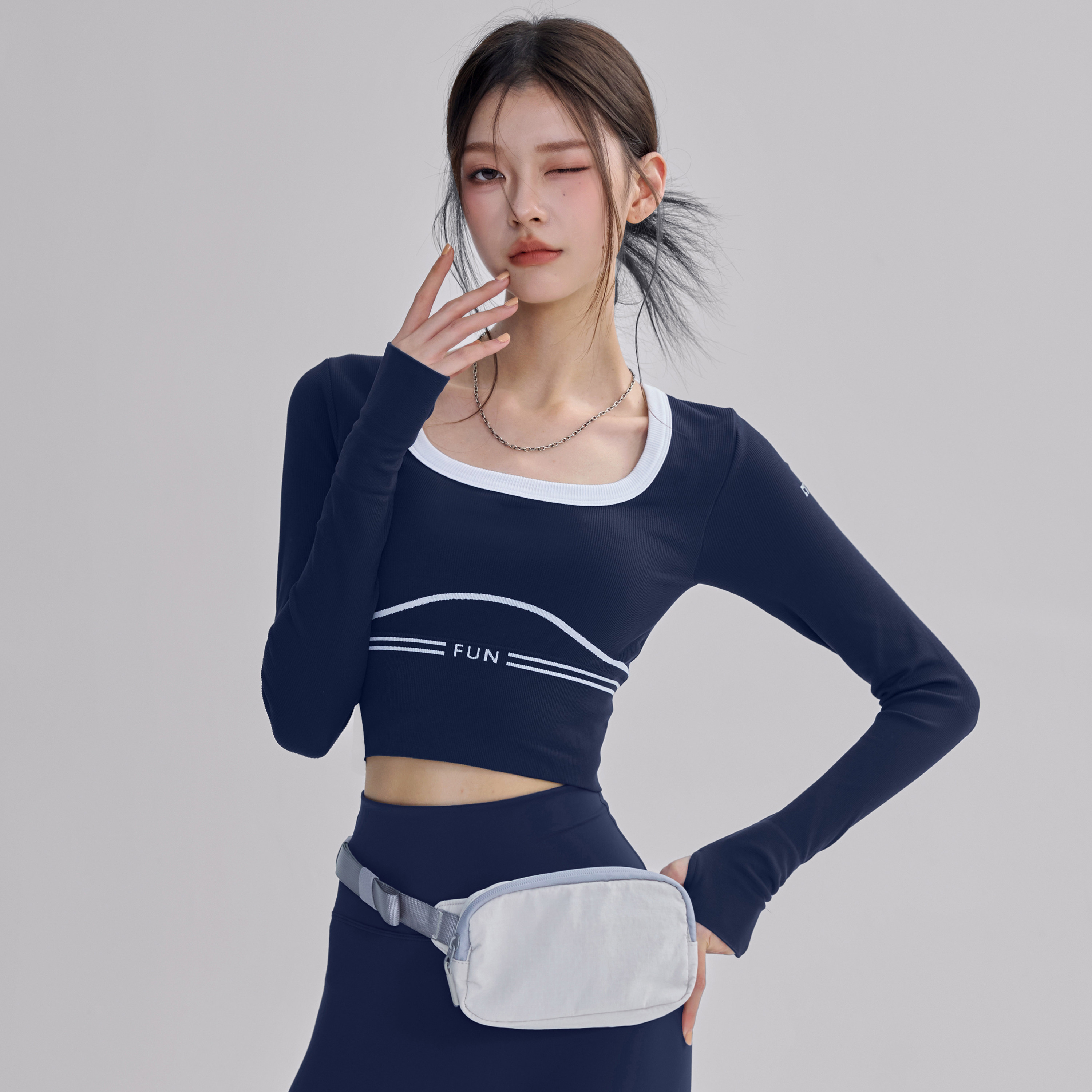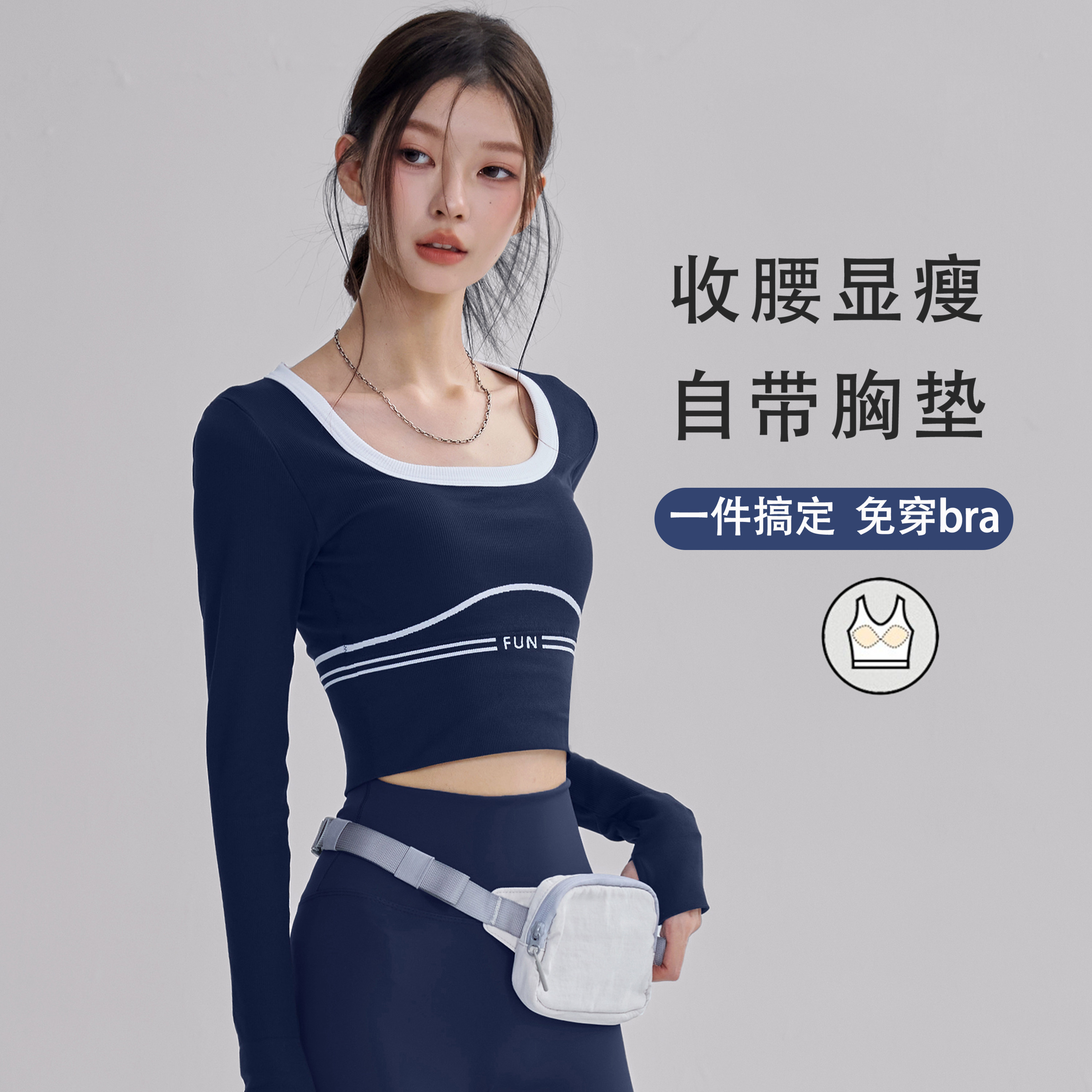方领瑜伽服女含胸垫跑步紧身短款健身运动上衣显瘦普拉提训练长袖